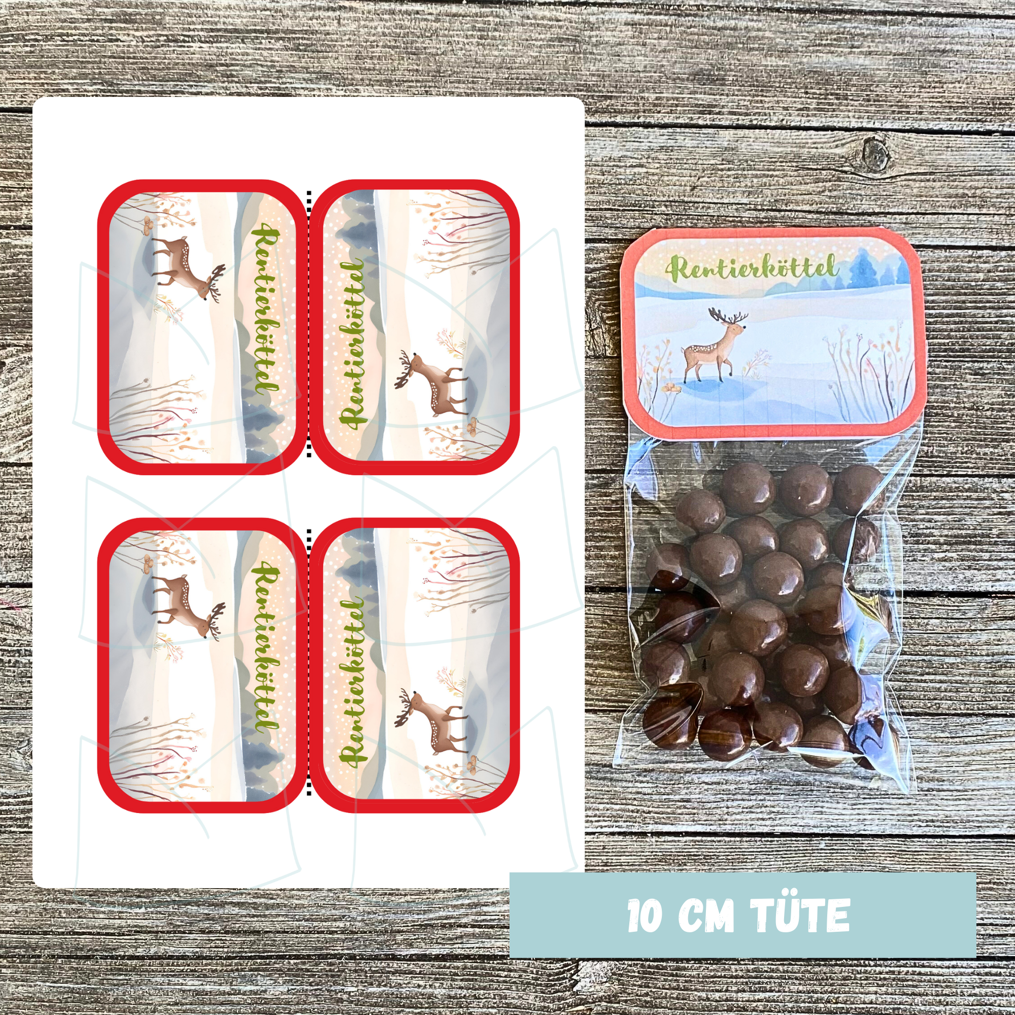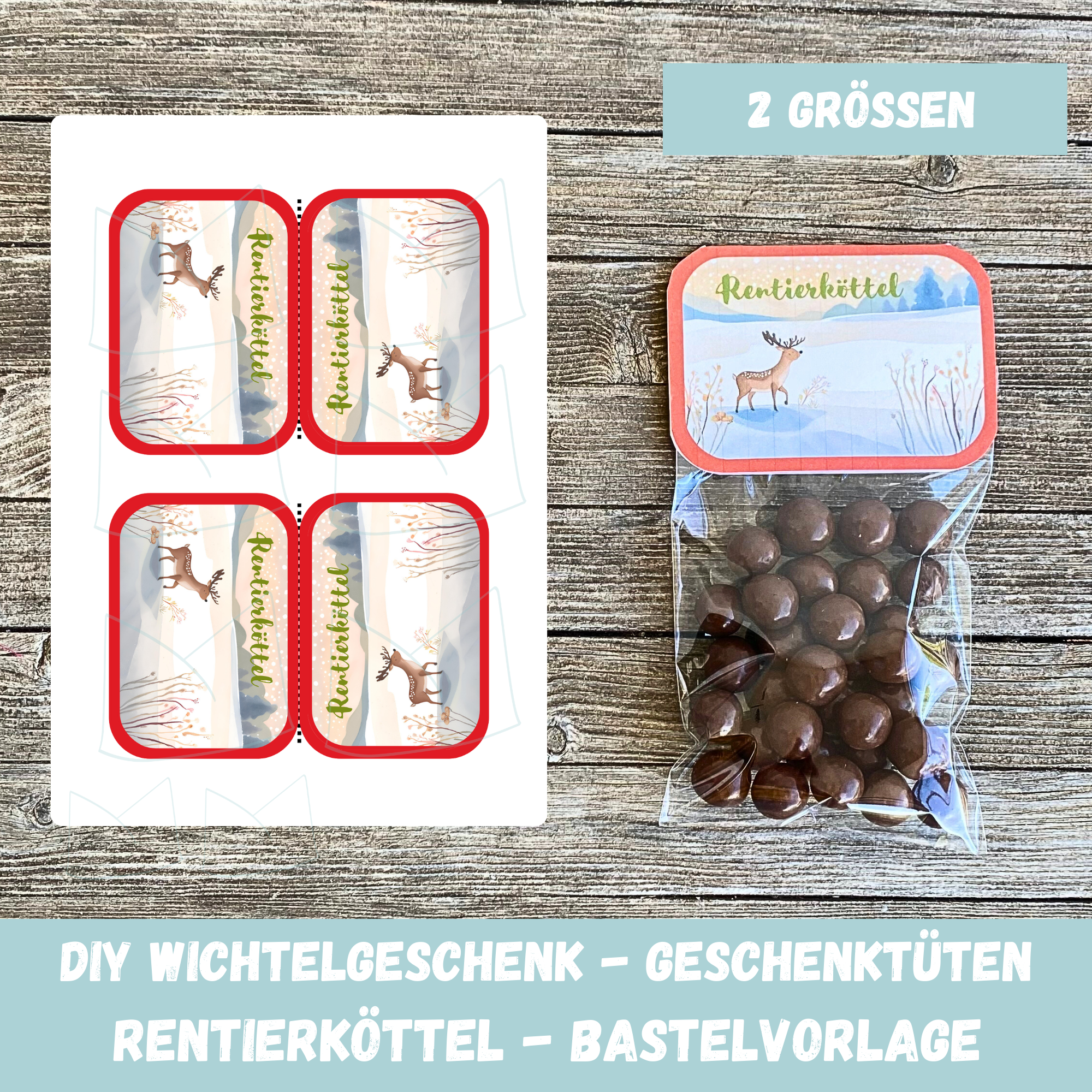 Durch die DIY Druckvorlage mit dem Bild eines Rentiers auf einer Wiese und dem Schriftzug Rentierköttel kann man ein wirklich lustiges Geschenk für Freunde und Familie in der Weihnachtszeit verpacken.