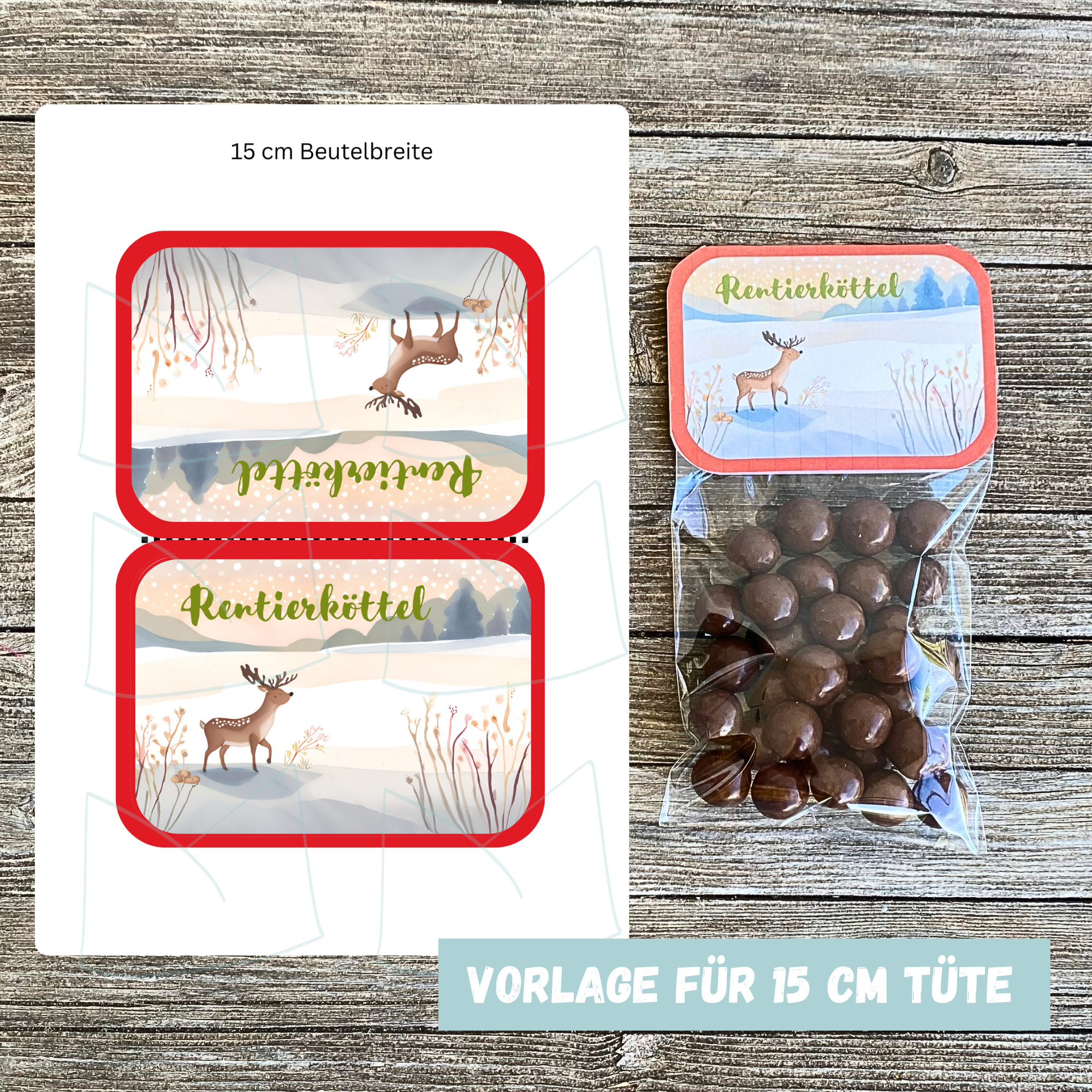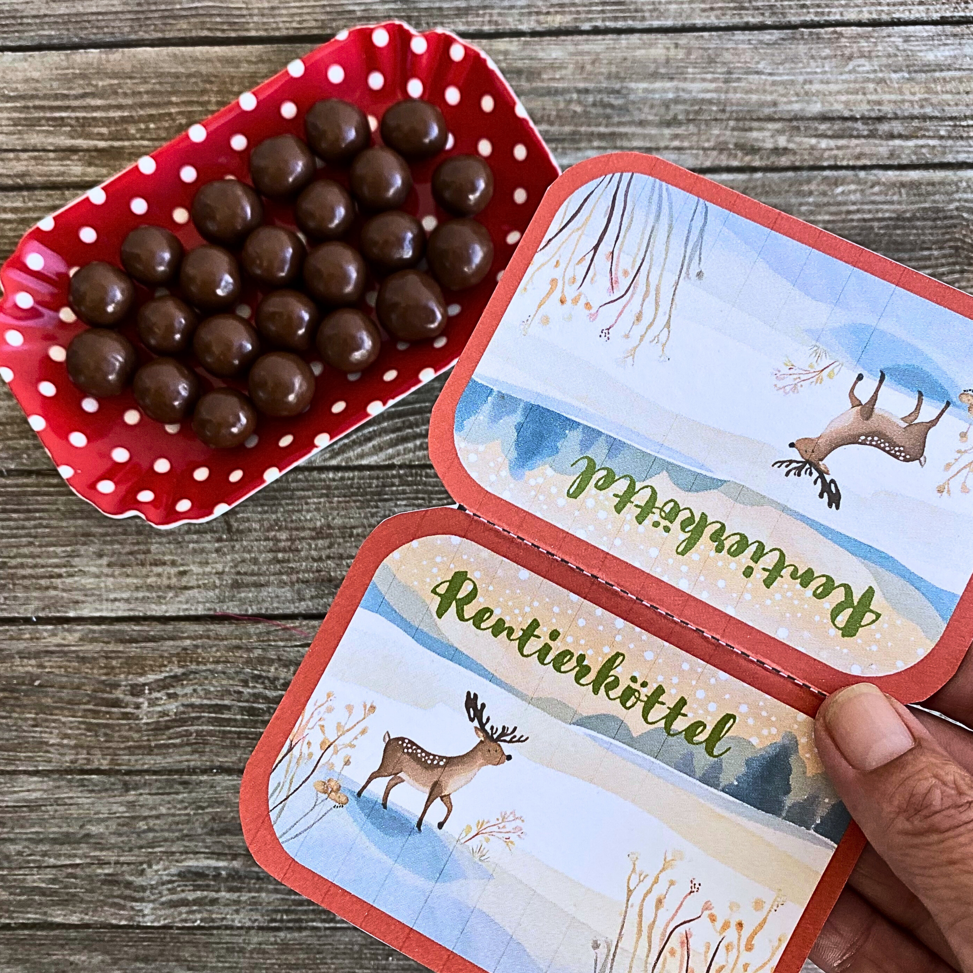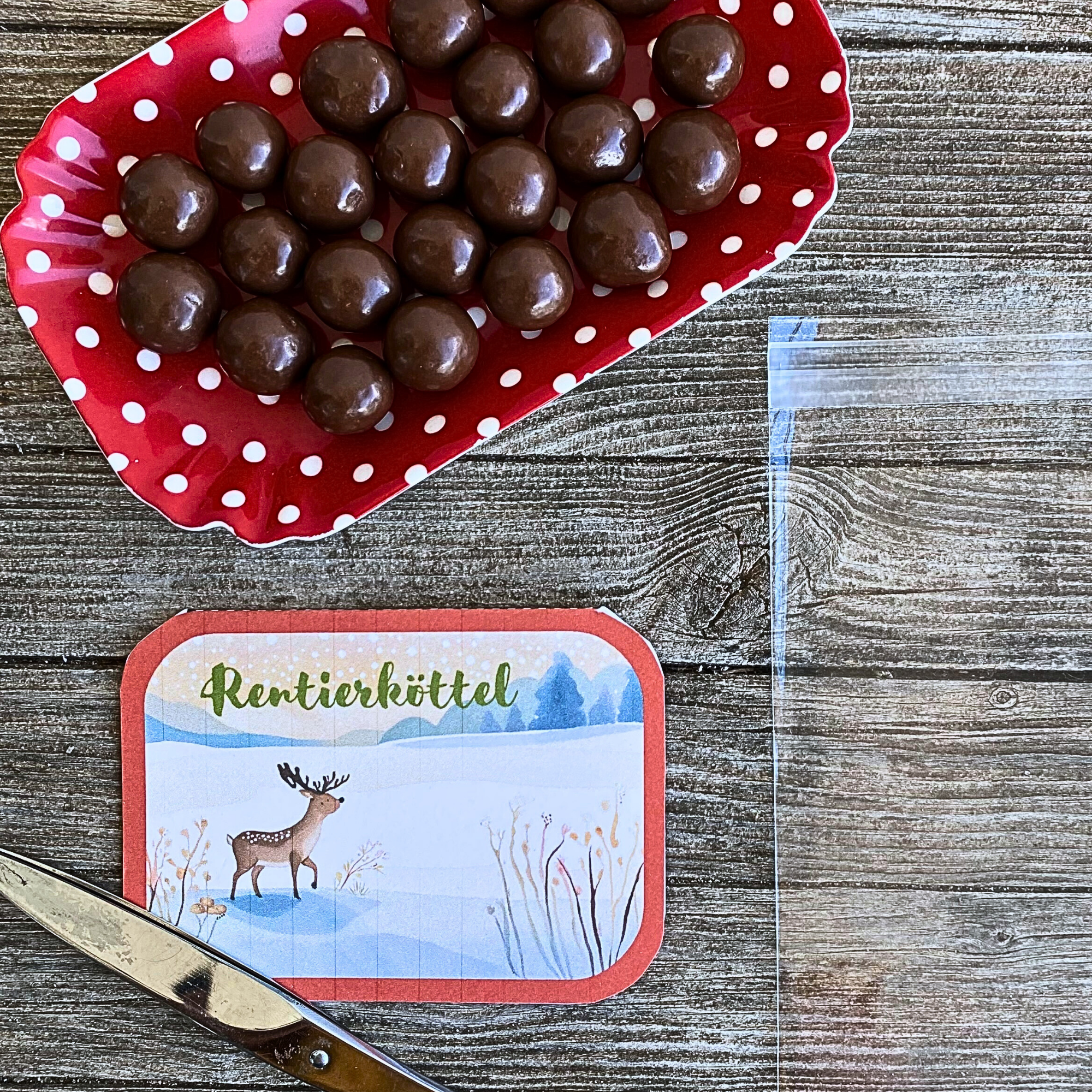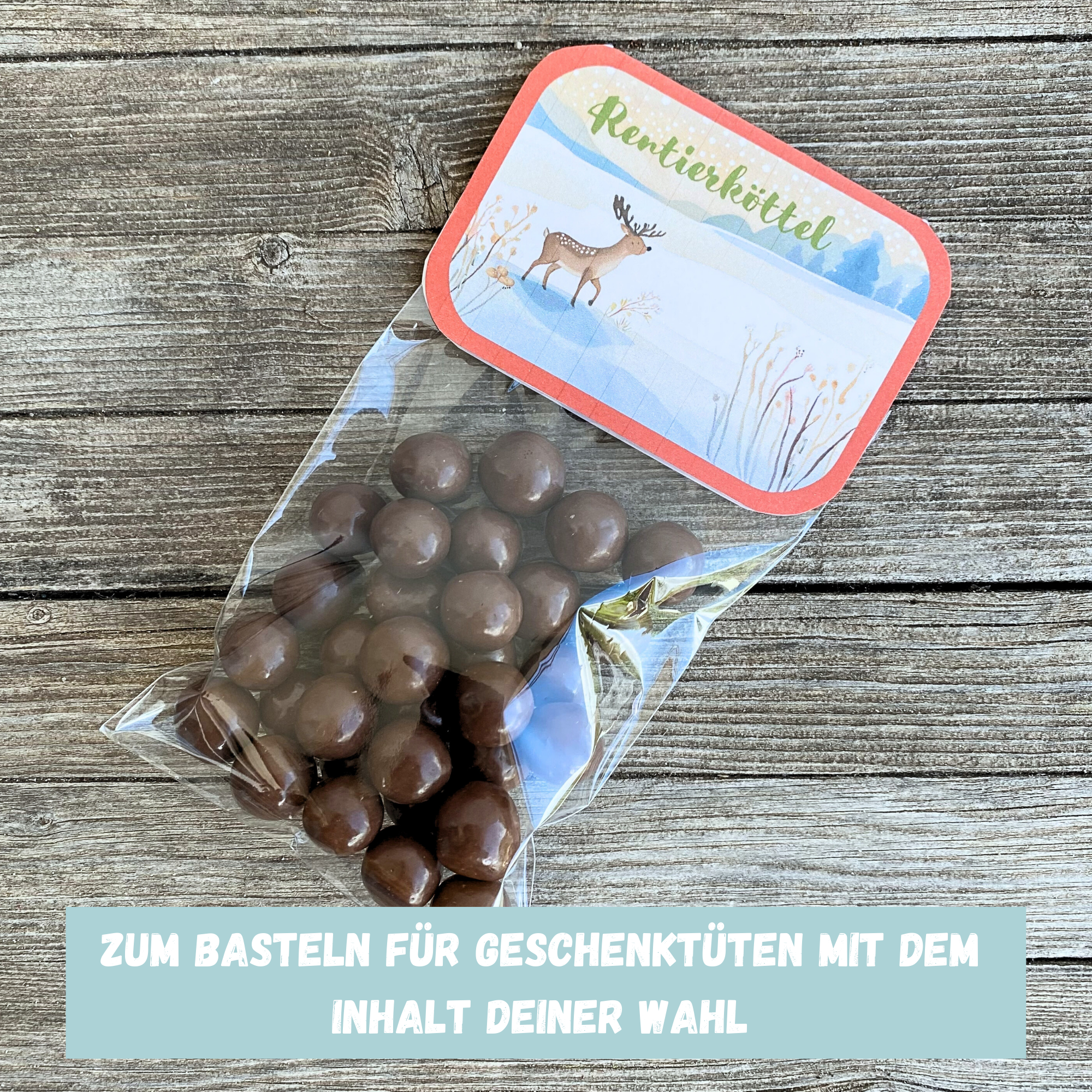 Eine lustige Verpackung, um in der Weihnachtszeit Süssigkeiten wie Schokorosinen oder andere kleine Schokobonbons zu verschenken ist unsere DIY Bastelvorlage für Rentierköttel.