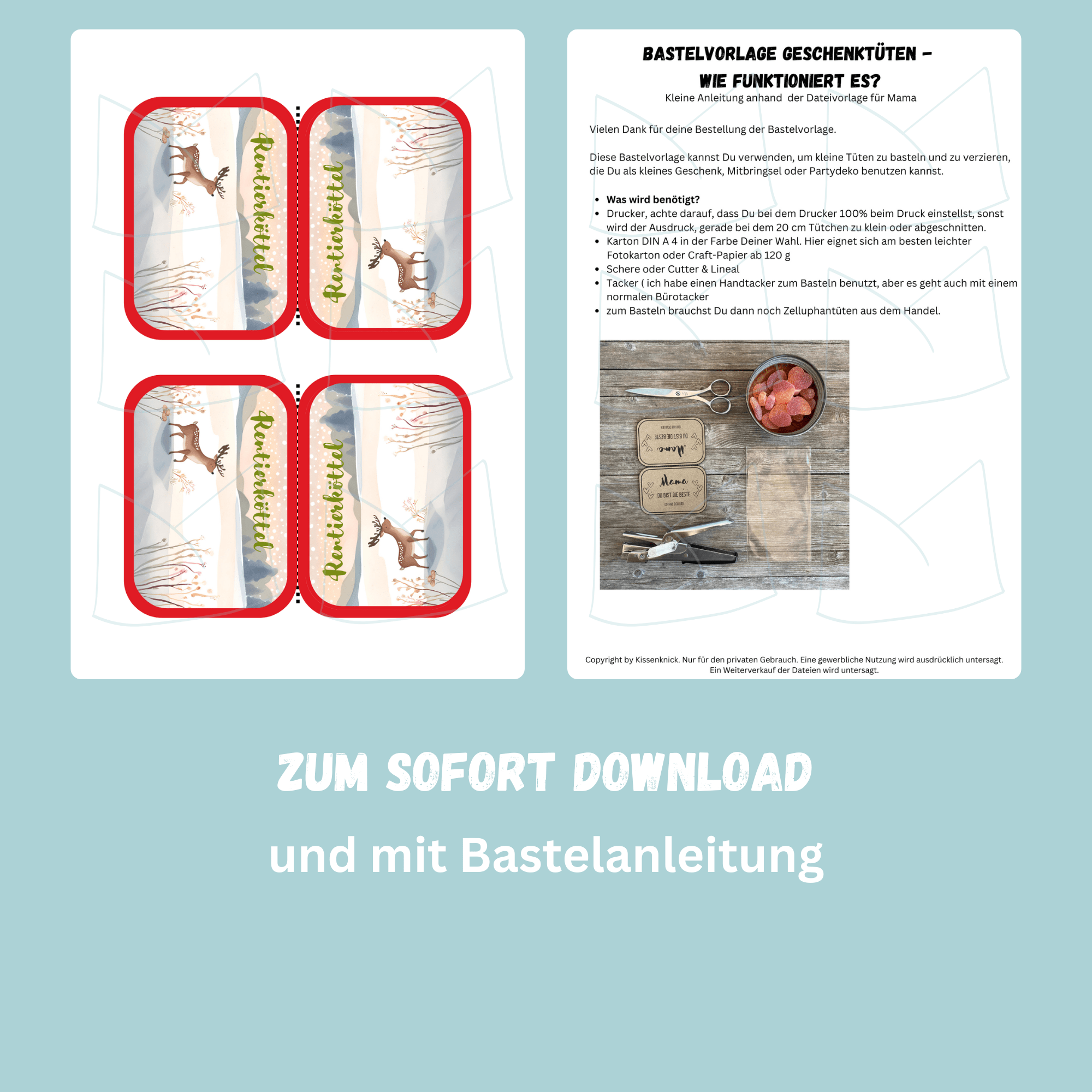 Ein gewerblicher Verkauf, Weitergabe oder Verfielfältigung wird untersagt. Solltest Du Geschenktüten gewerblich verkaufen oder verteilen wollen, findest Du dazu die passende Lizenz in unserem Shop.