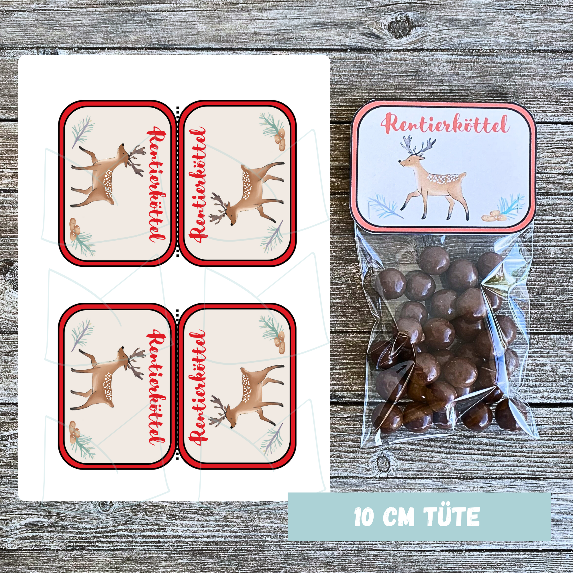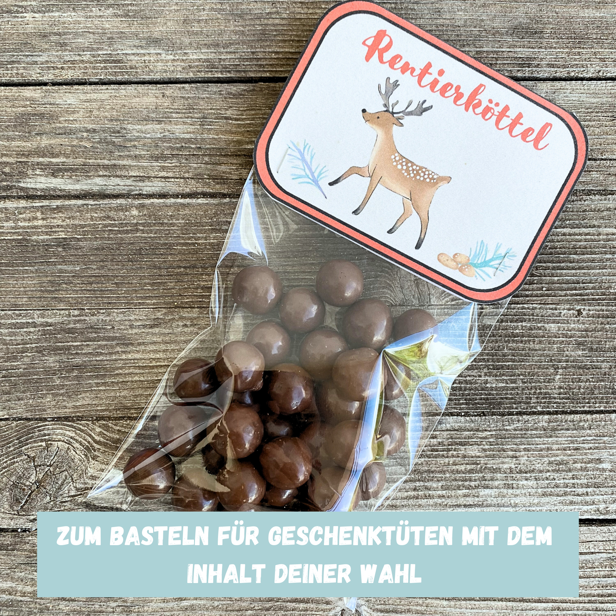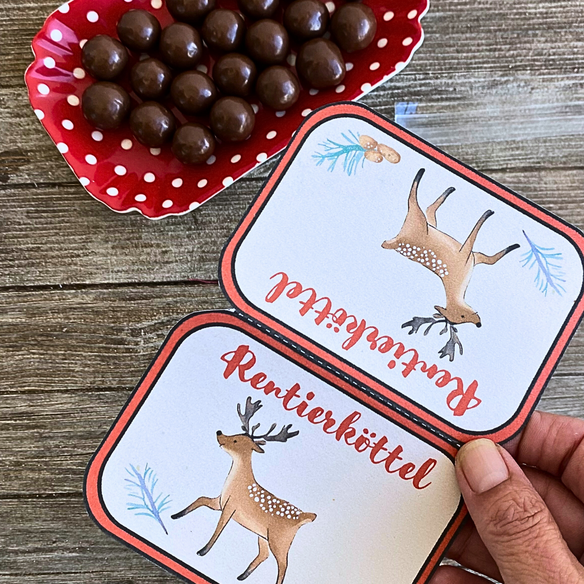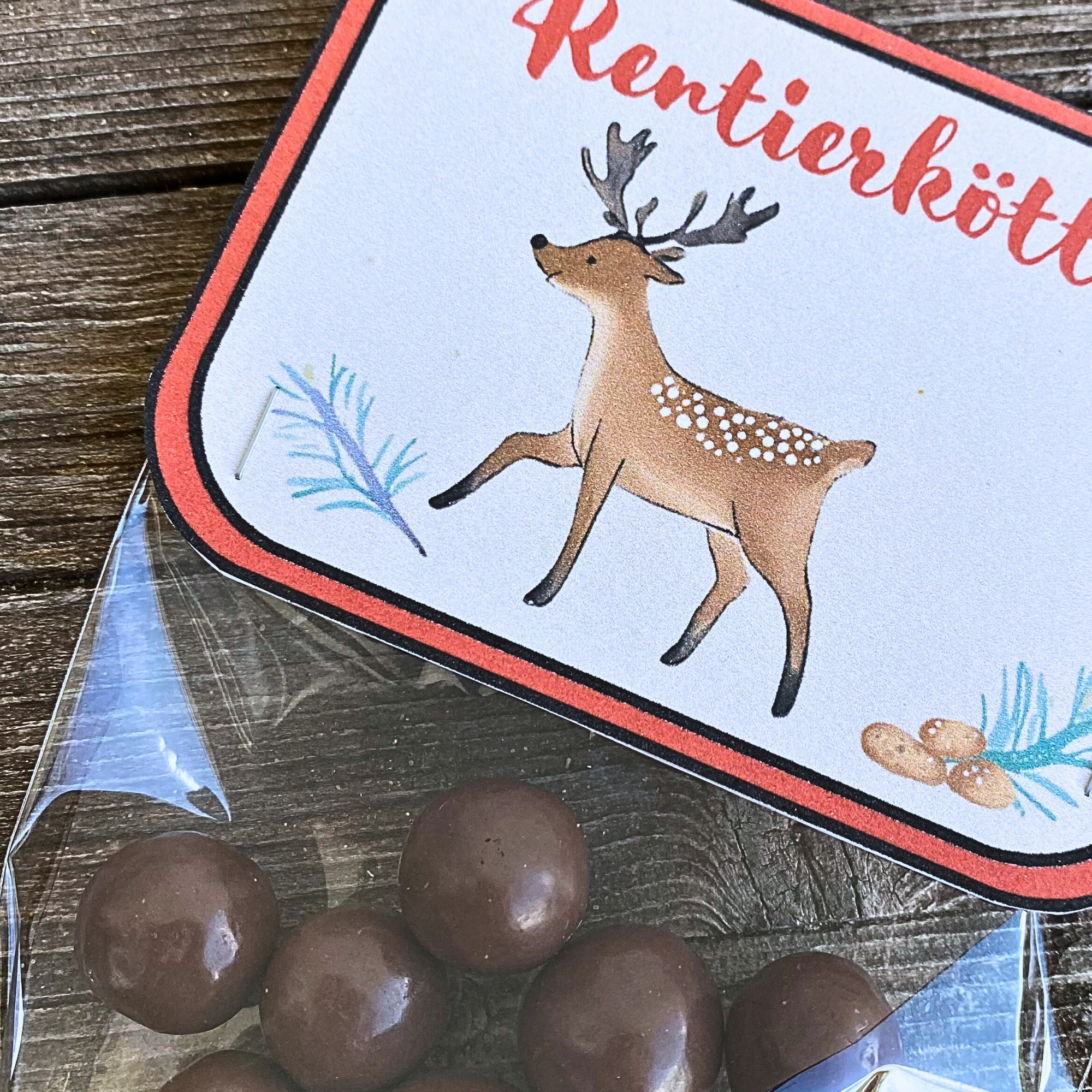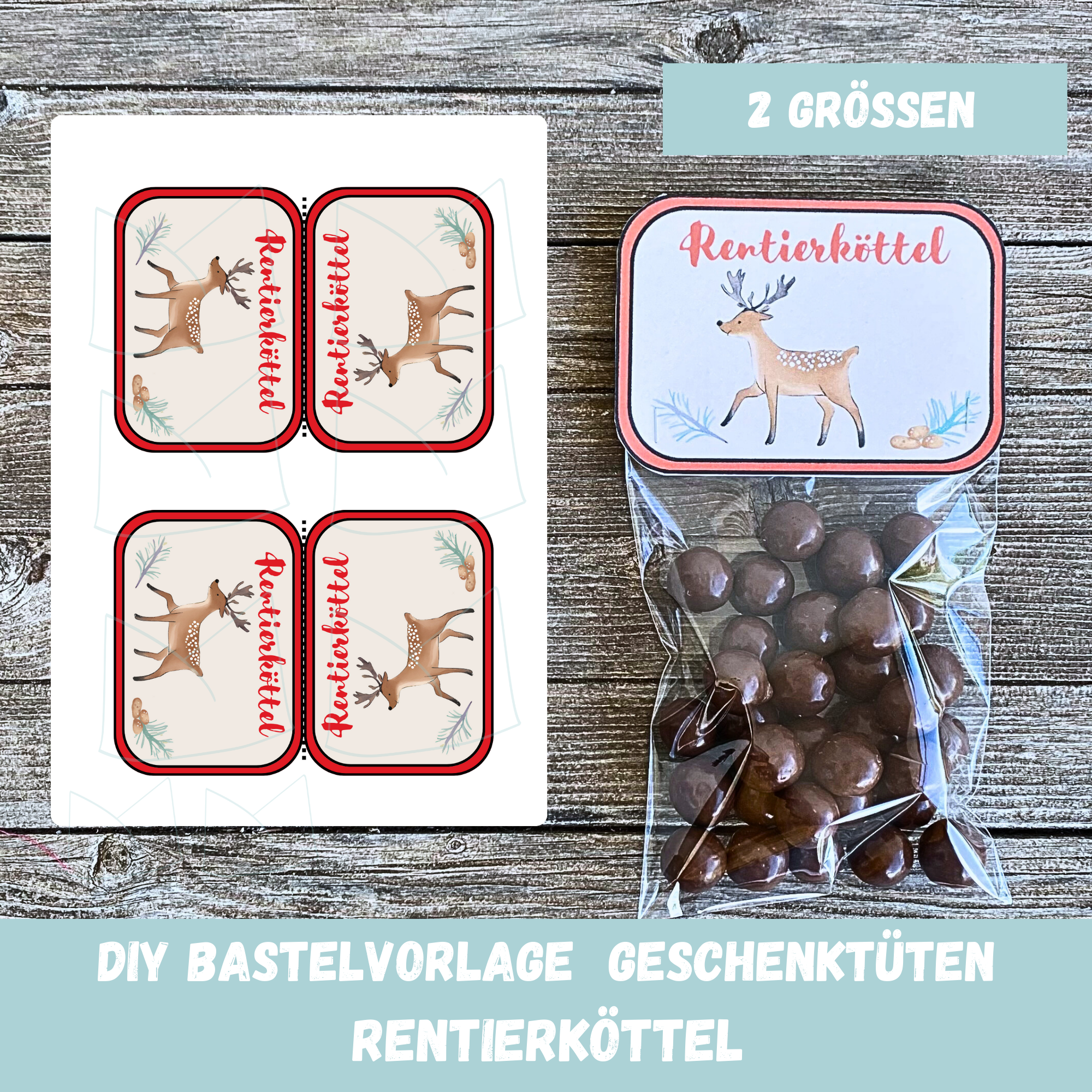 Durch die DIY Druckvorlage mit einem Rentier und dem Schriftzug Rentierköttel kann man ein wirklich lustiges Geschenk für Freunde und Familie in der Weihnachtszeit verpacken. Süsses Mitbringsel, was auf jeden Fall die Leute zum Lachen bringt.