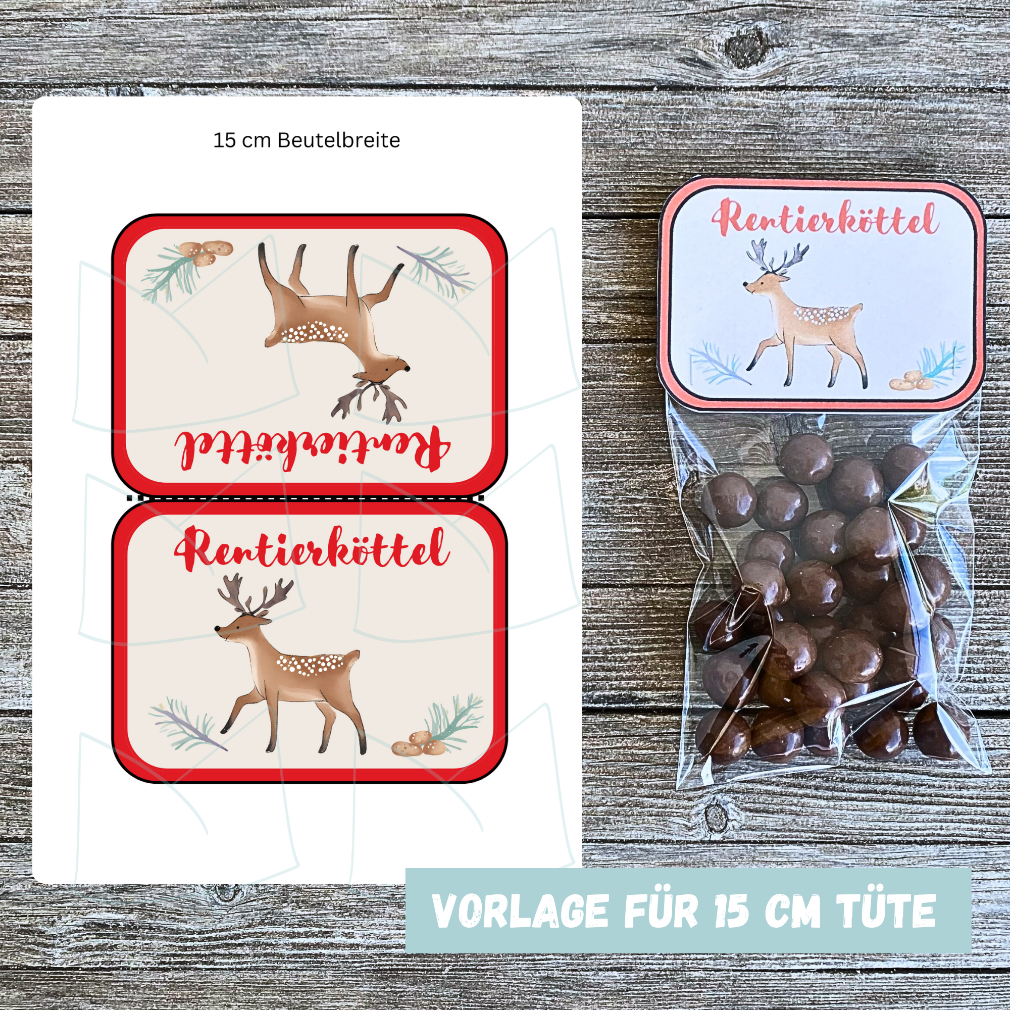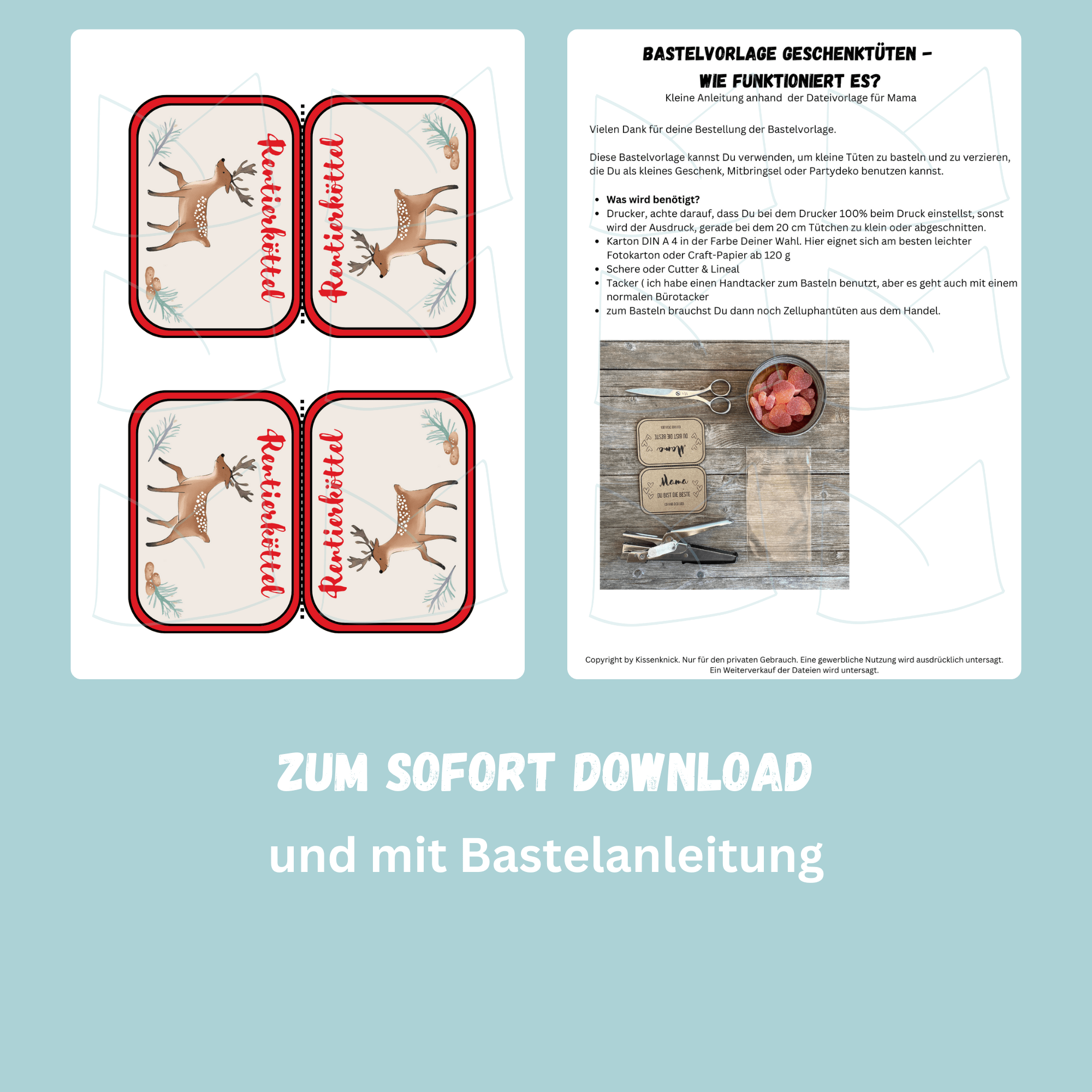 Die DIY Bastelvorlage Rentierköttel ist eine lustige Möglichkeit einer Verpackung, um in der Weihnachtszeit Süssigkeiten wie Schokorosinen oder andere kleine Schokobonbons zu verschenken.