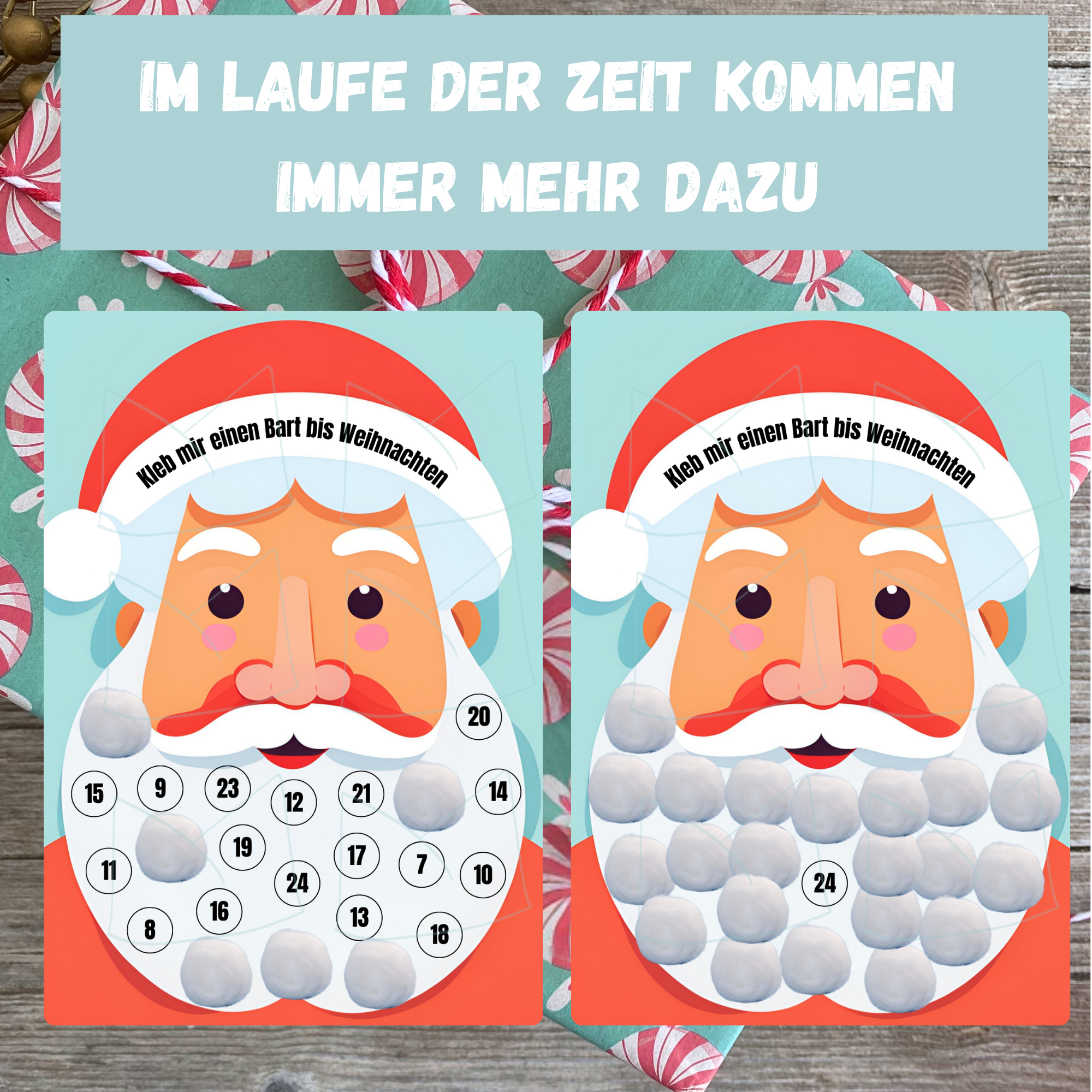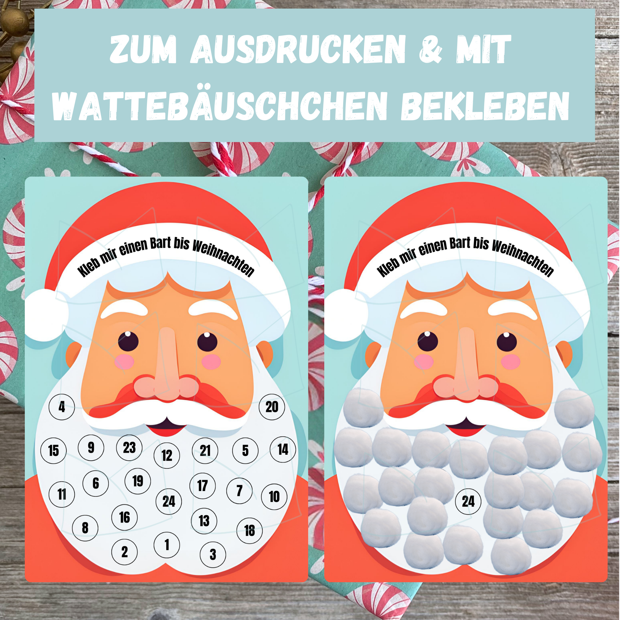 Klebe 24 Tage lange mit Hilfe von Wattebäuschchen dem Weihnachtsmann einen Vollbart. Ein lustiger Countdown Kalender bis Heilig Abend.