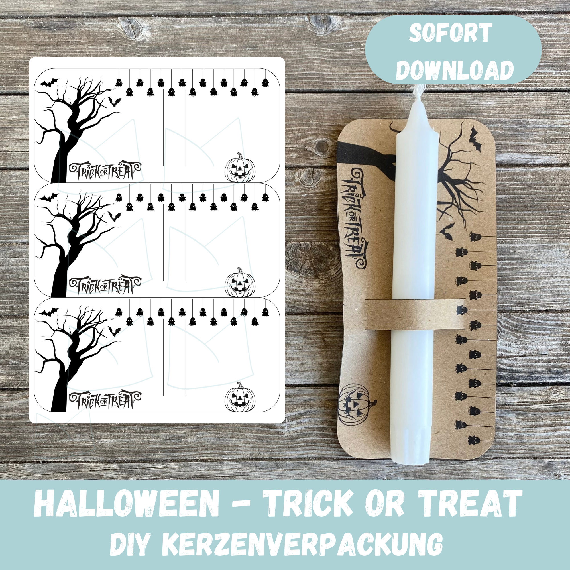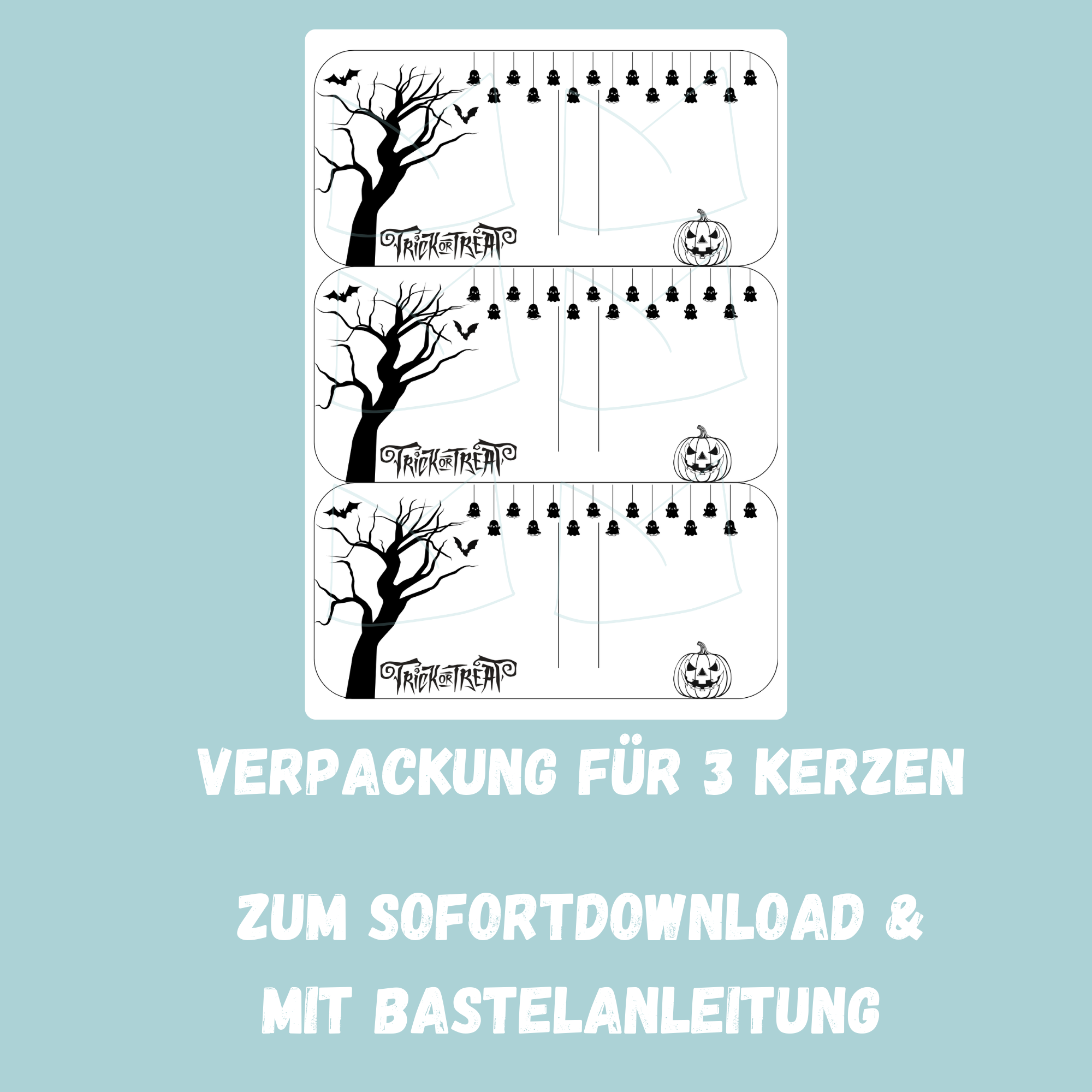 Trick or treat – Gruselige Bastelvorlage für Halloween, um Kerzen oder andere kleine Geschenke oder Mitbrinsel zu verpacken.