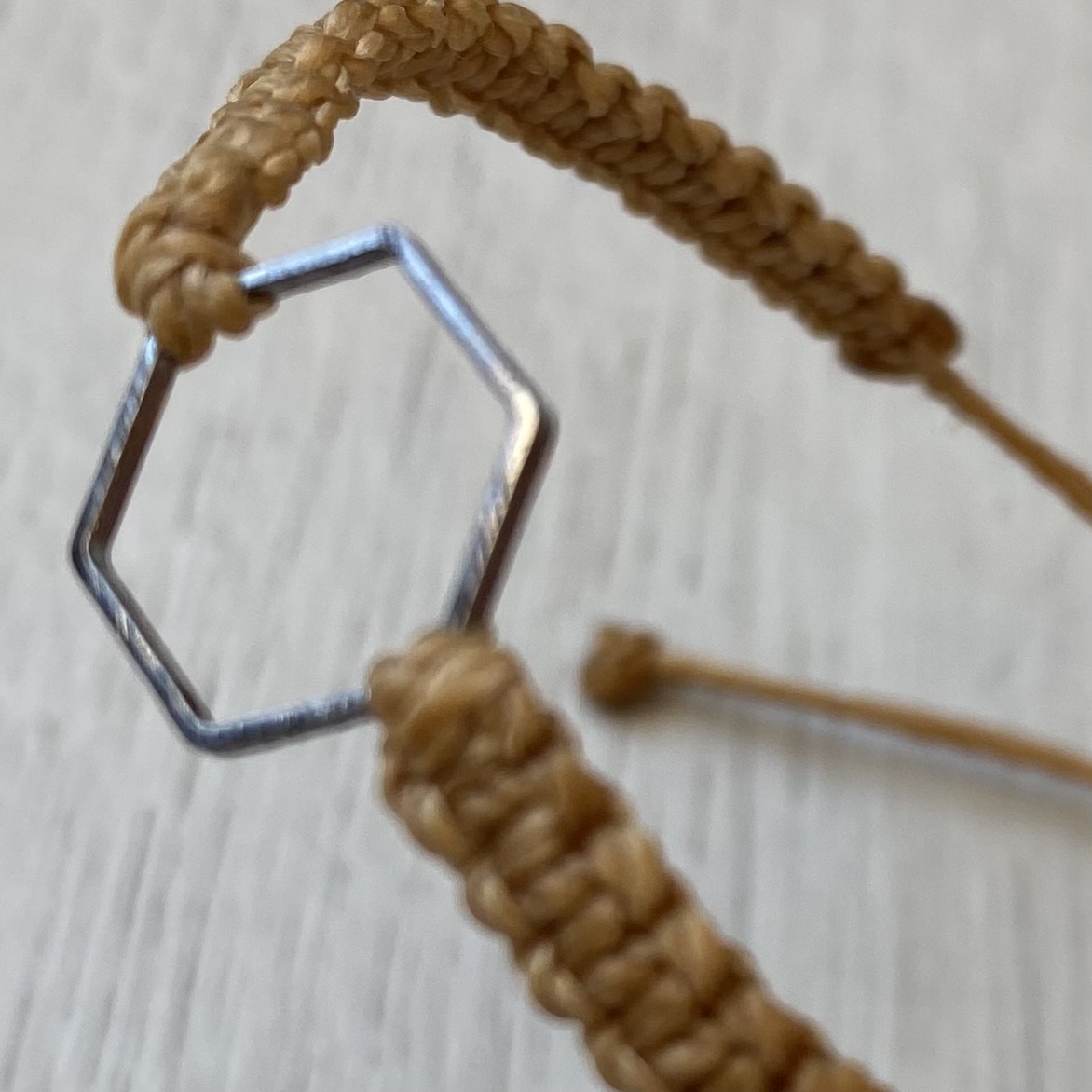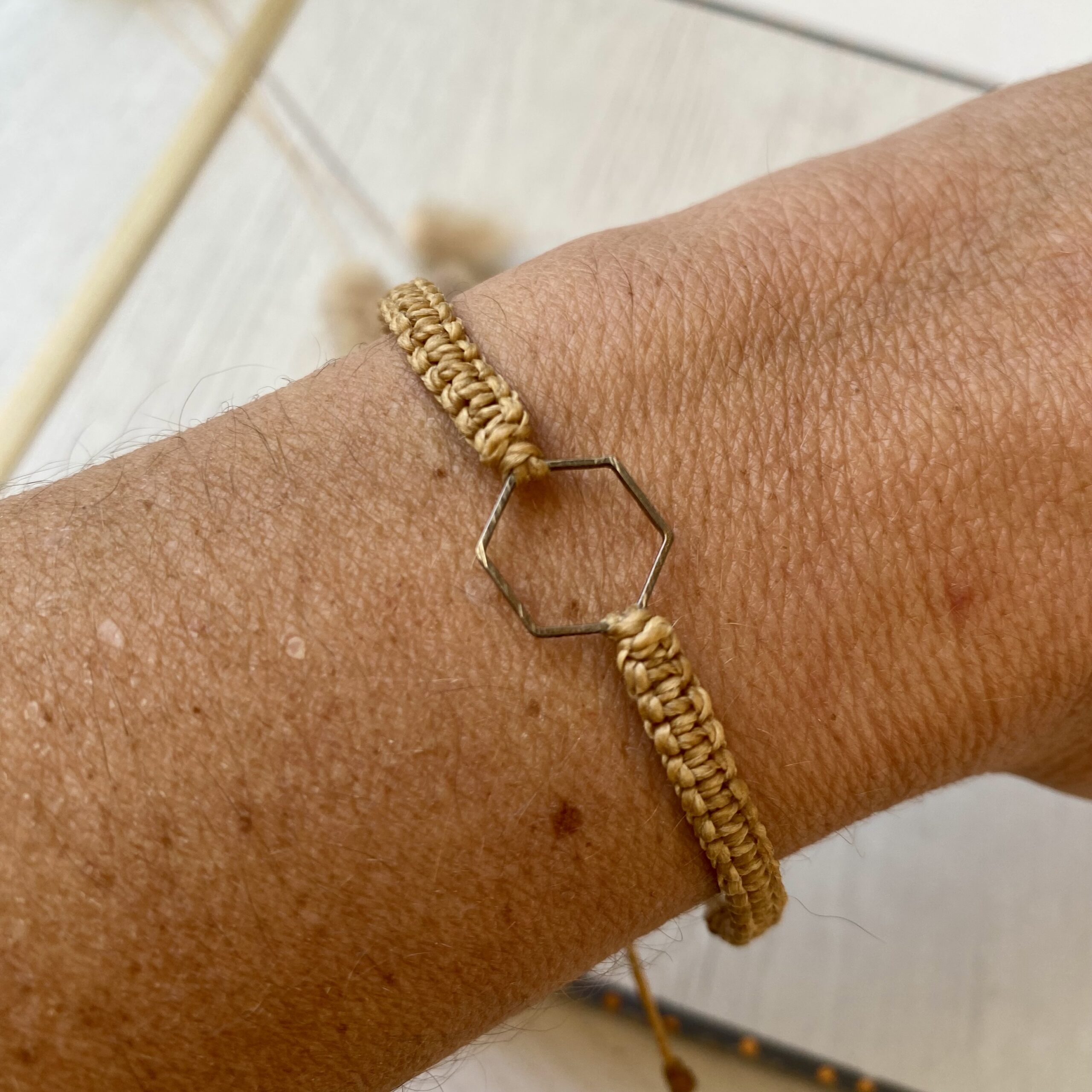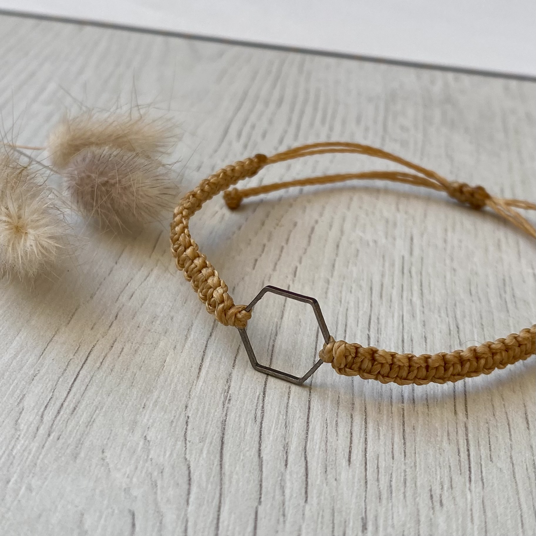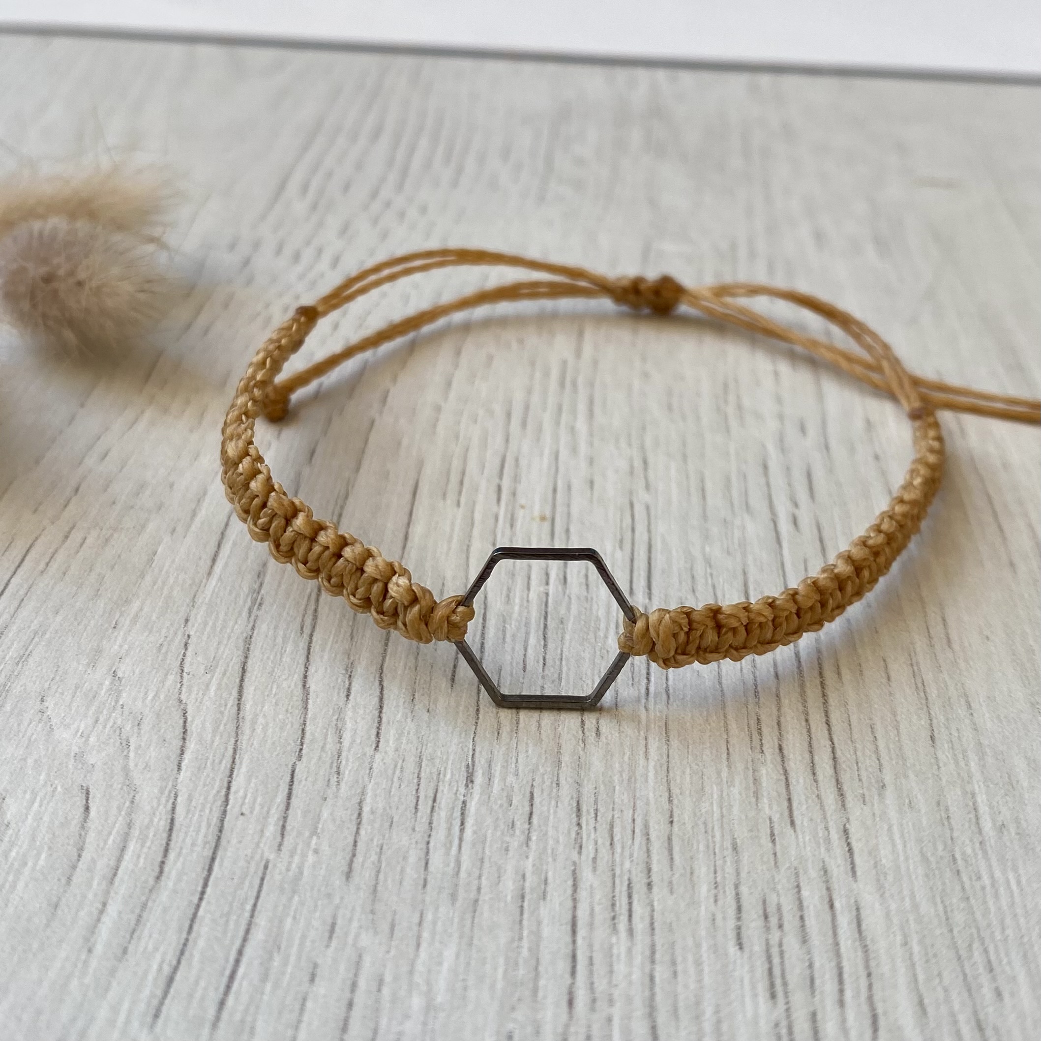 Unser Makramee-Armband mit dem versilberten Hexagon ist ein wundervolles Geschenk für Dich selbst und auch als Freundschaftsarmband, denn das Hexagon steht für Harmonie und Gleichgewicht. Die Garnfarbe kannst du passend nach Deinem Geschmack auswählen.