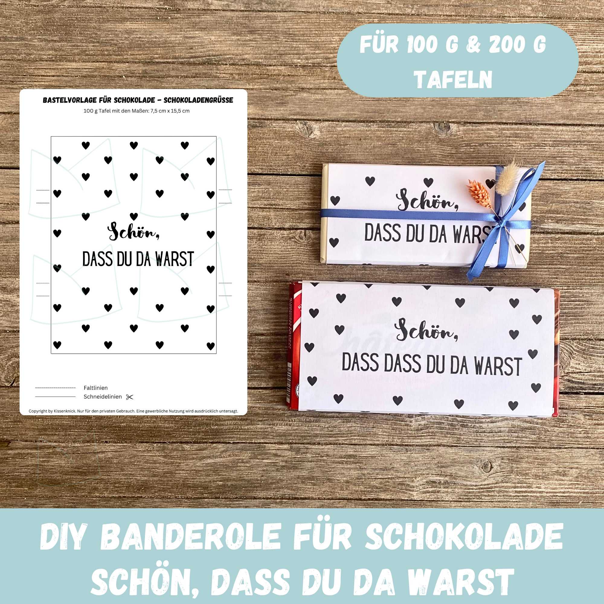 Ob als kleines Gastgeschenk bei Eurer Hochzeit, als Dankeschön auf der Geburtstagsfeier oder für Deine Kolleg:innen bei der Firmenfeiern – diese Schokoladen Banderole ist eine schöne Verpackung für alle Gelegenheiten und Veranstaltungen, wo Du sagen kannst „Schön, dass Du da warst“