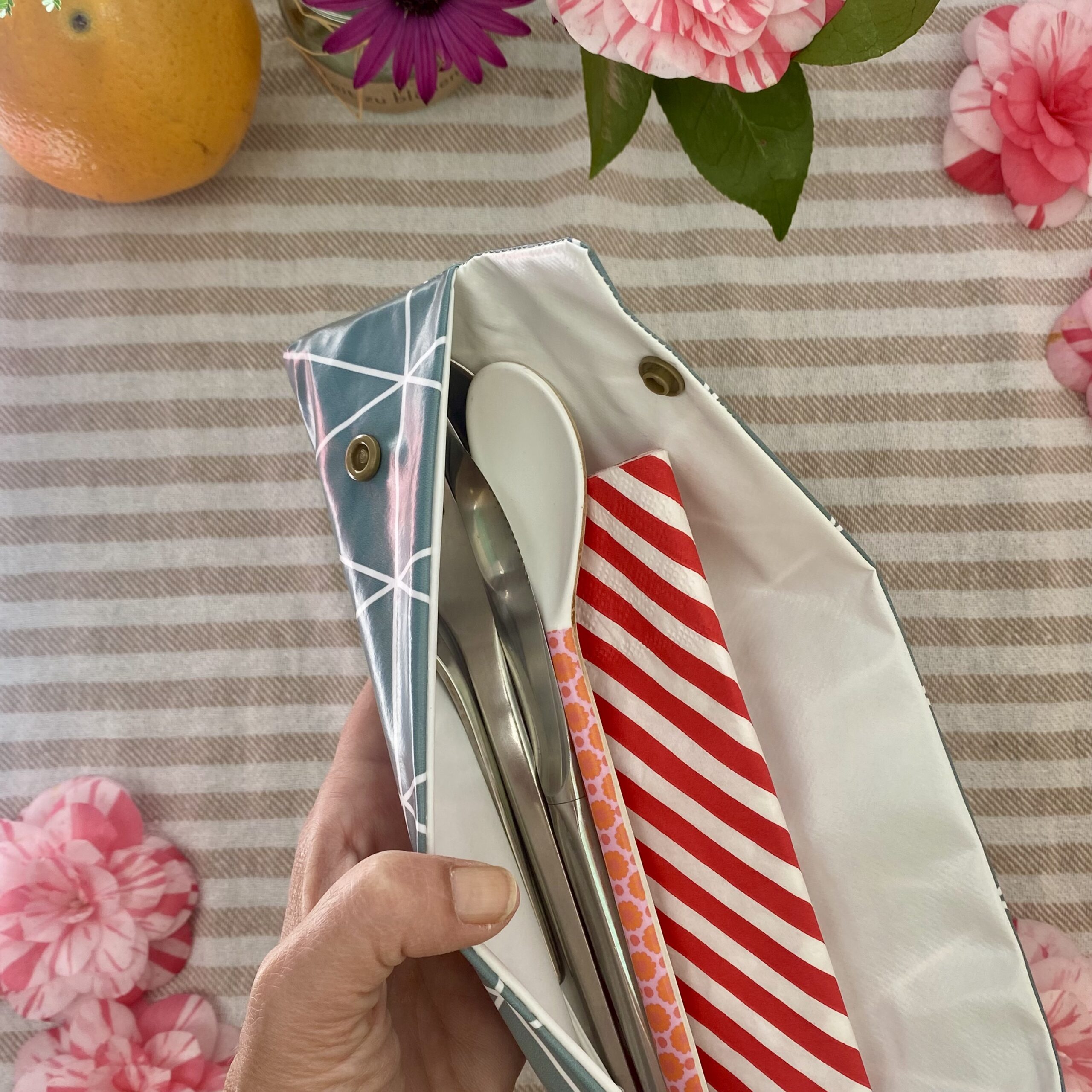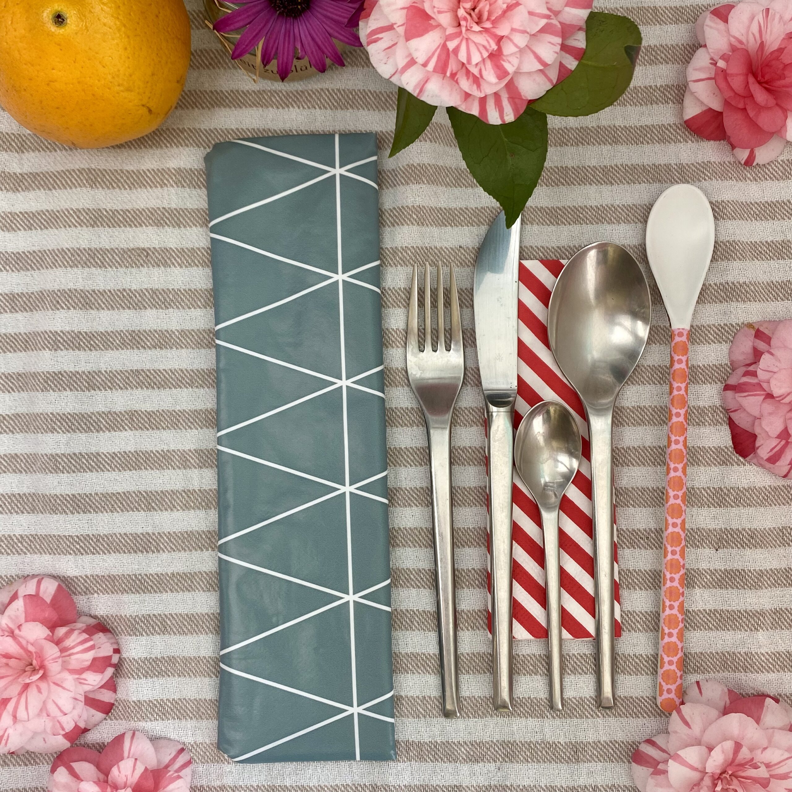 Bestecktasche für Camping, Reise und Picknick in antrazit grau mit weißem Rautenmuster. Das Mäppchen ist innen und aussen aus abwaschbarem Material und somit ideal, um Dein Messer, Gabel, Löffel unterwegs hygienisch und nachhaltig zu transportieren.