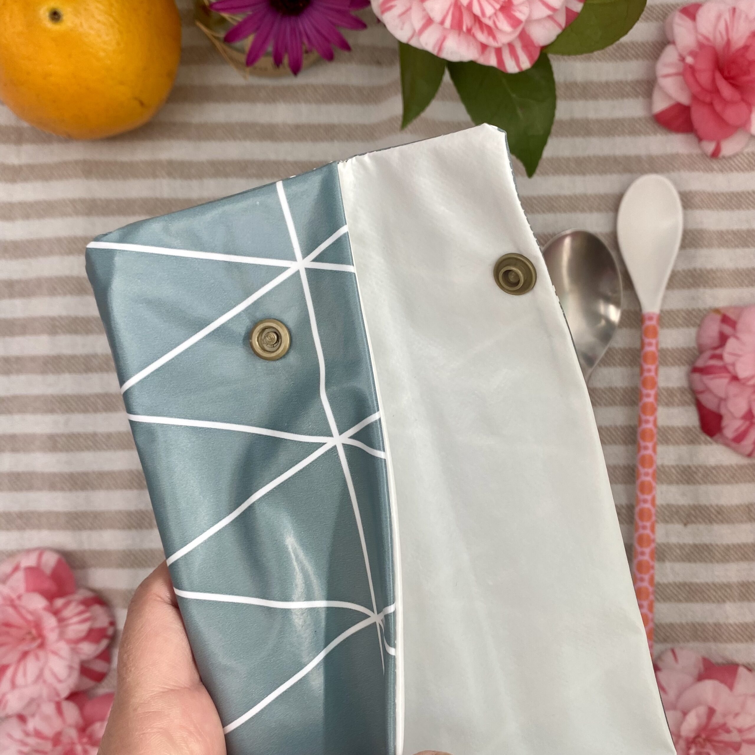 Aussen hat die Bestecktasche eine beschichtete Baumwolle und innen ist sie mit einem Wachstuch ausgestattet.
