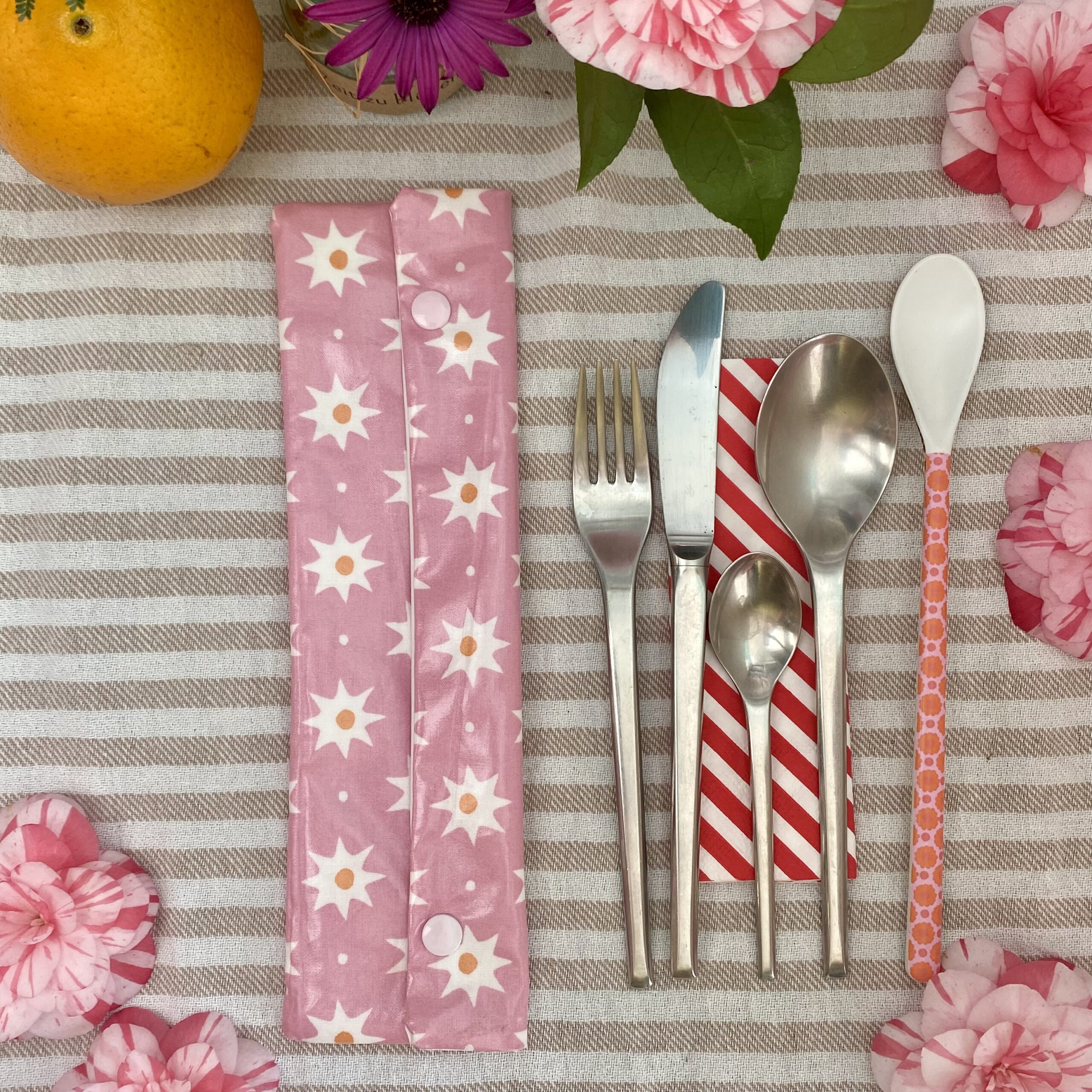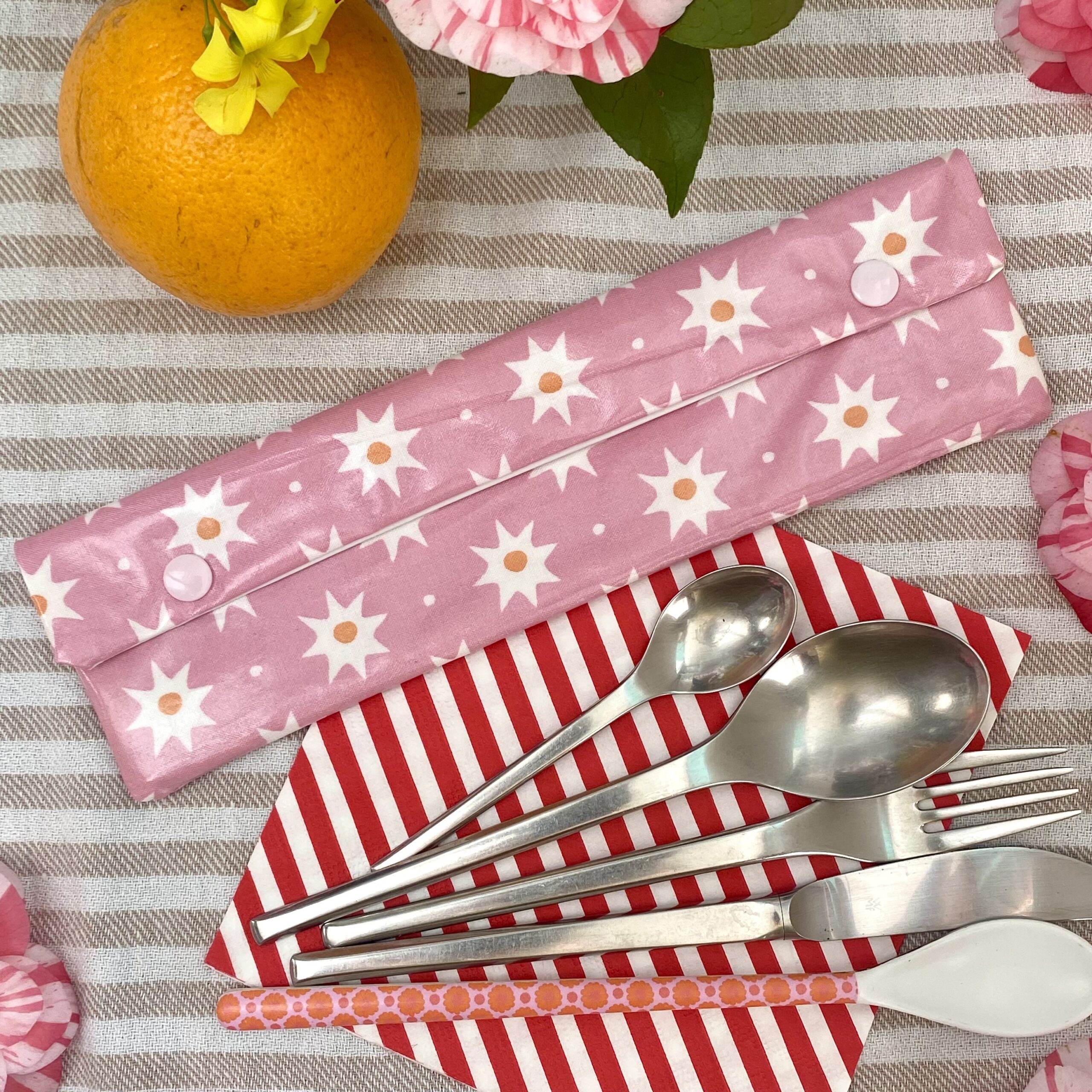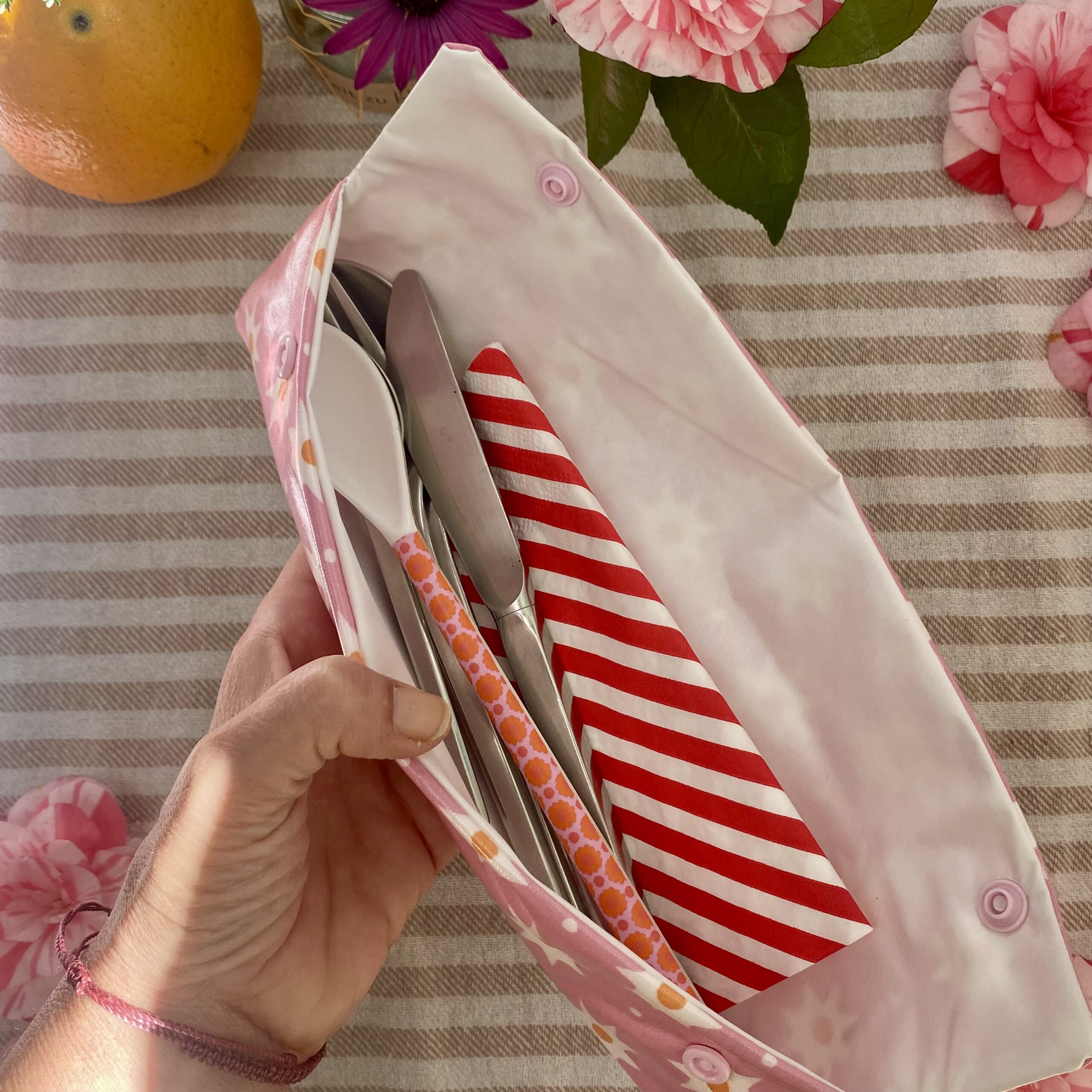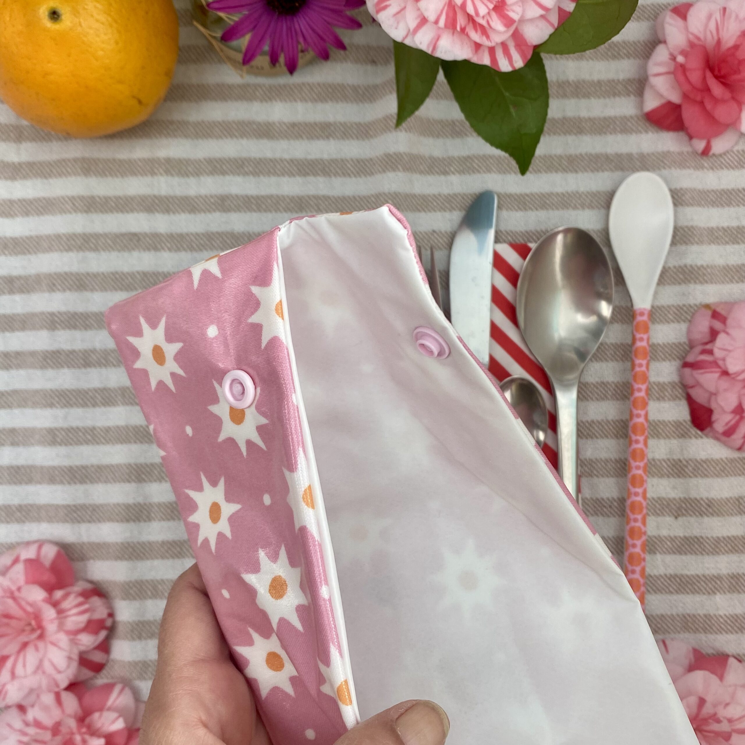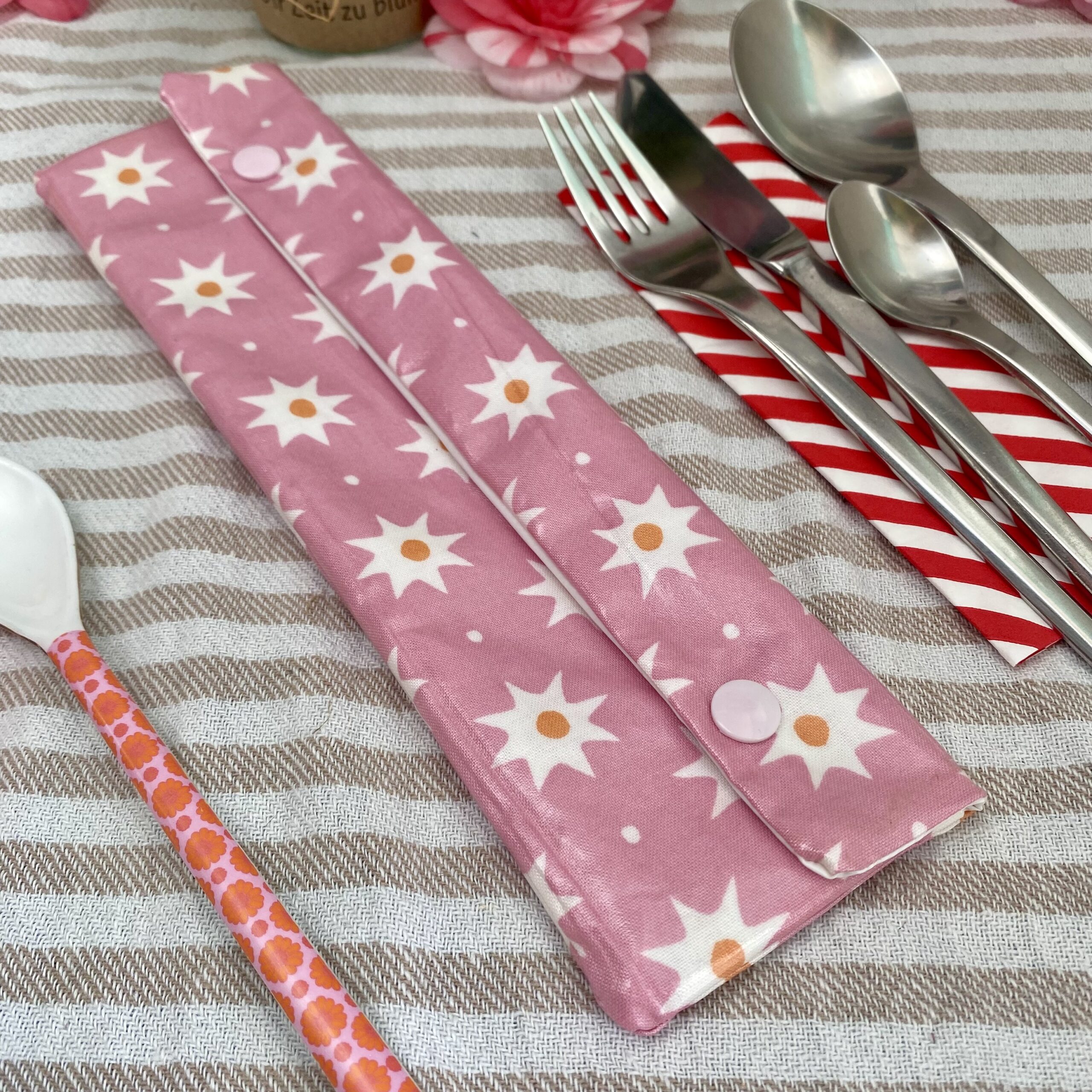 FrĂŒhlingshafte Bestecktasche fĂŒr Camping, Reise und Picknick in rosa mit Blumen. Das MĂ€ppchen ist innen und aussen aus abwaschbarem Material und somit ideal, um Dein Messer, Gabel, Löffel unterwegs hygienisch und nachhaltig zu transportieren.