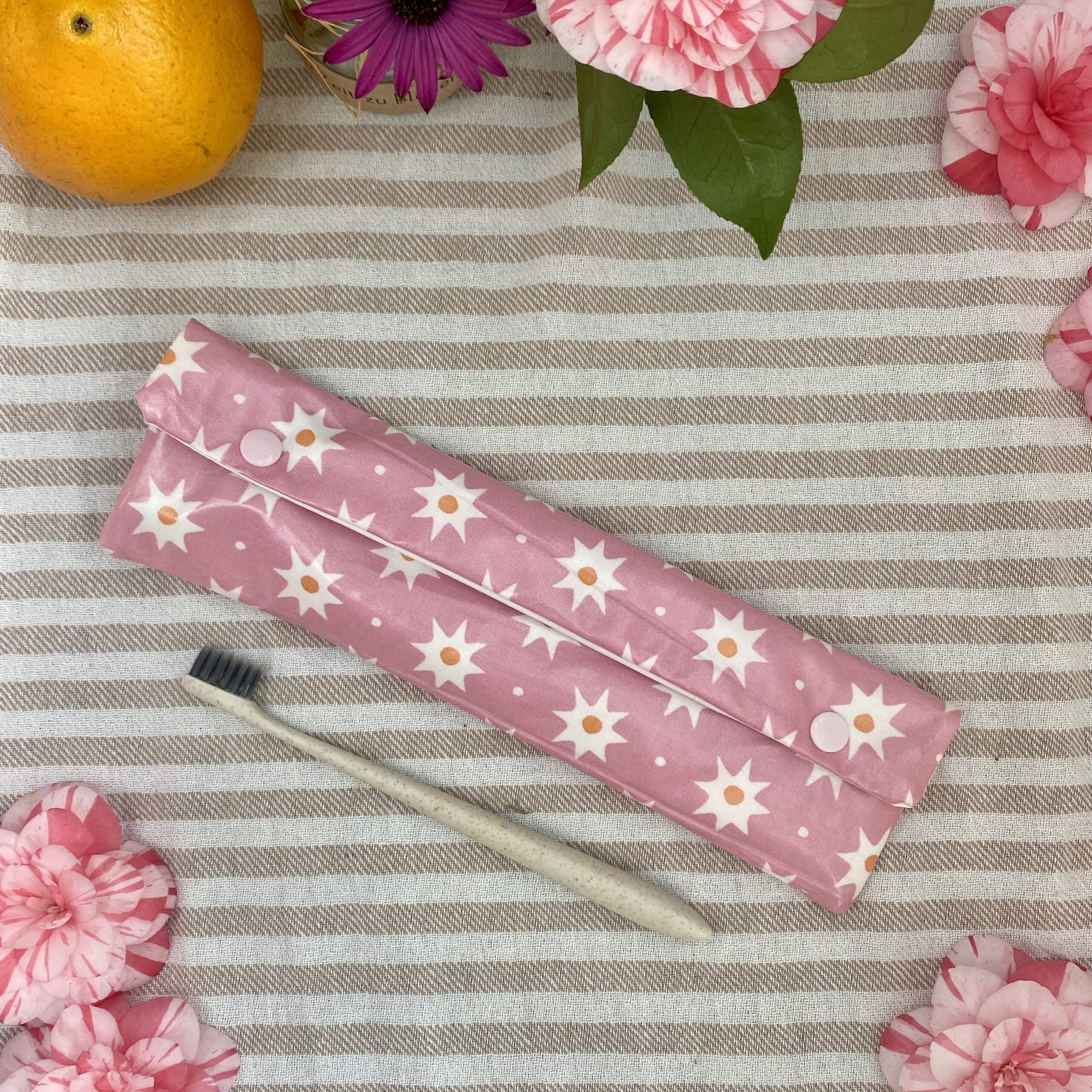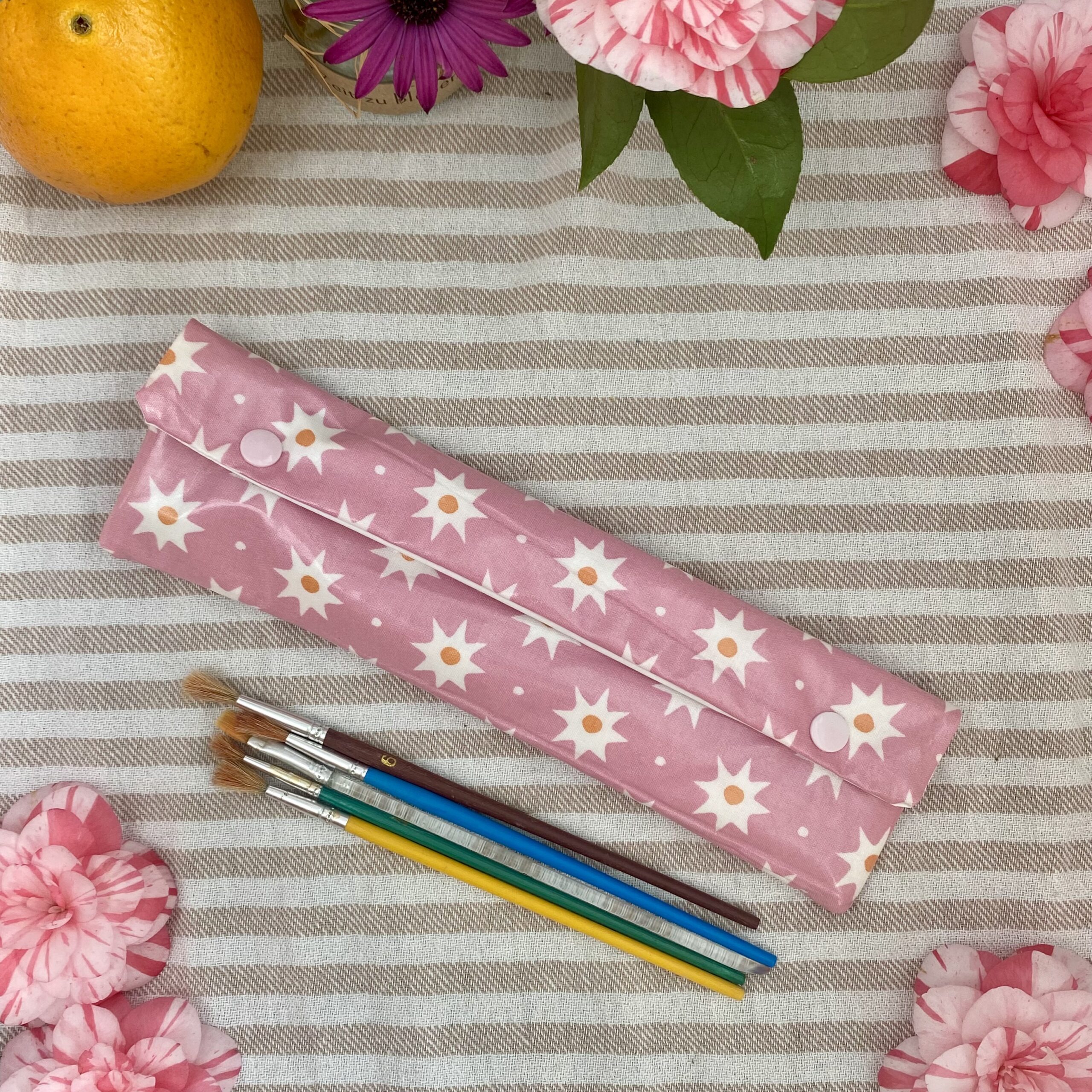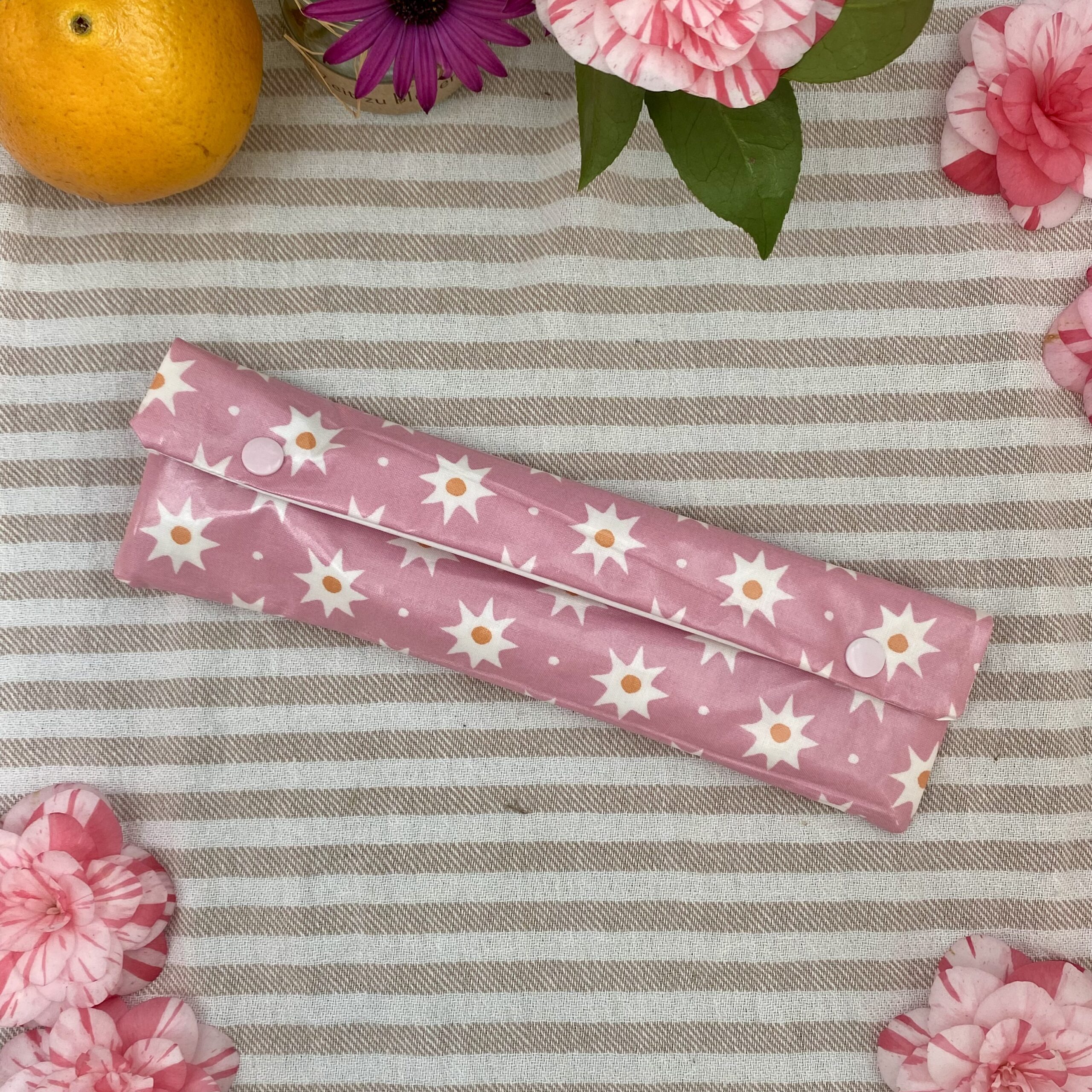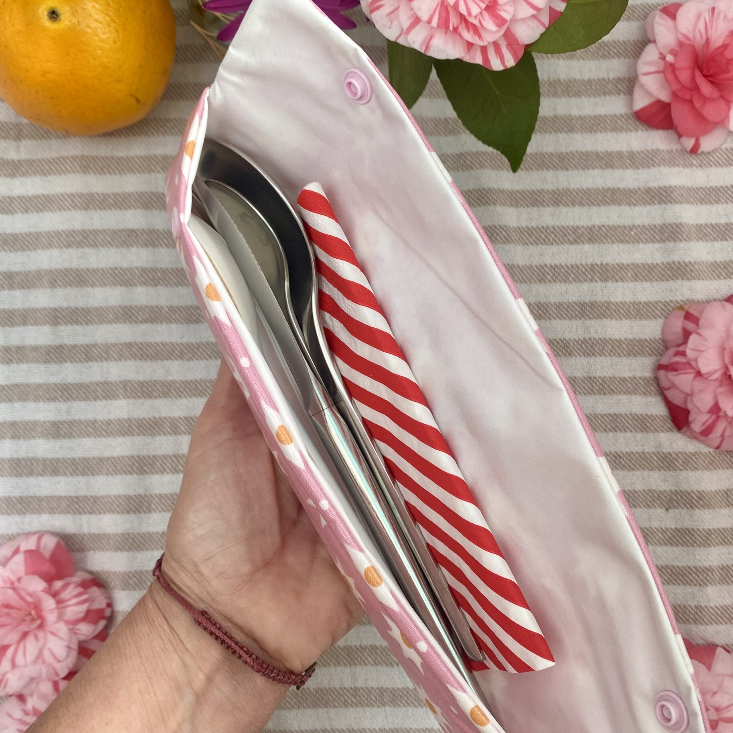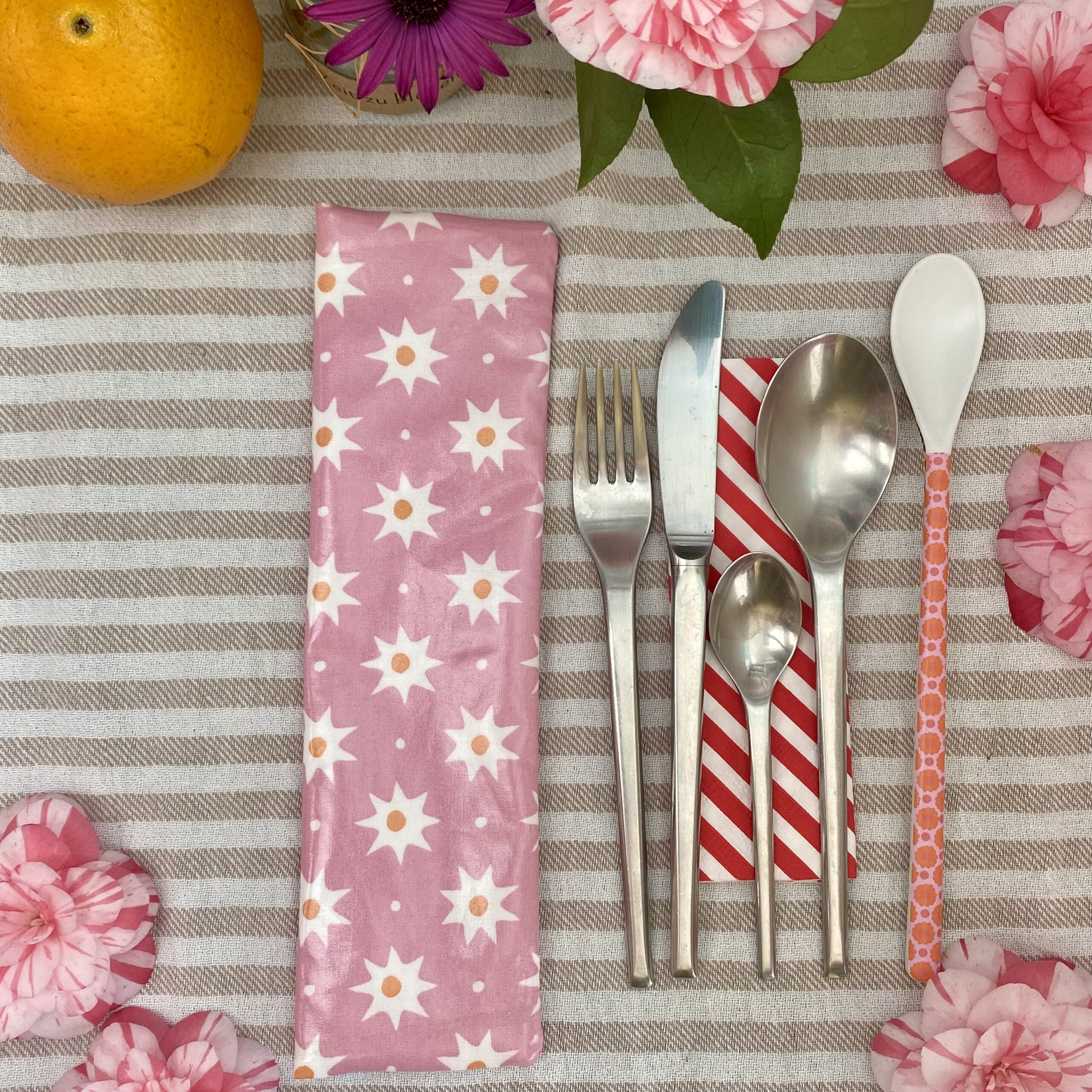 FrĂŒhlingshafte Bestecktasche fĂŒr Camping, Reise und Picknick in rosa mit Blumen. Das MĂ€ppchen ist innen und aussen aus abwaschbarem Material und somit ideal, um Dein Messer, Gabel, Löffel unterwegs hygienisch und nachhaltig zu transportieren.