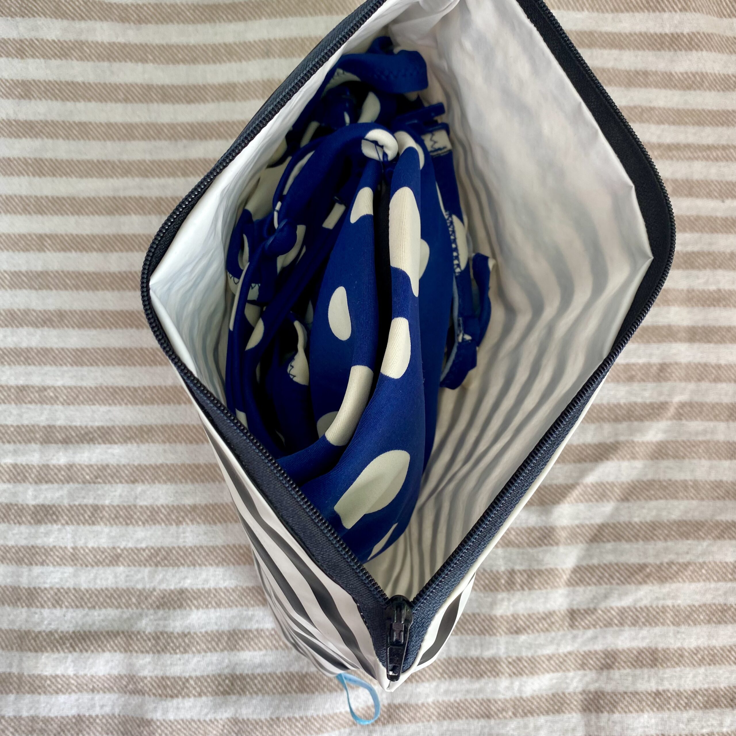 Das Wetbag mit Streifen in schwarz-weiß besteht aussen und innen aus einem wasserabweisenden Wachstuch, so dass Dein Bikini, Badeanzug oder die Badehose sicher verstaut werden kann.