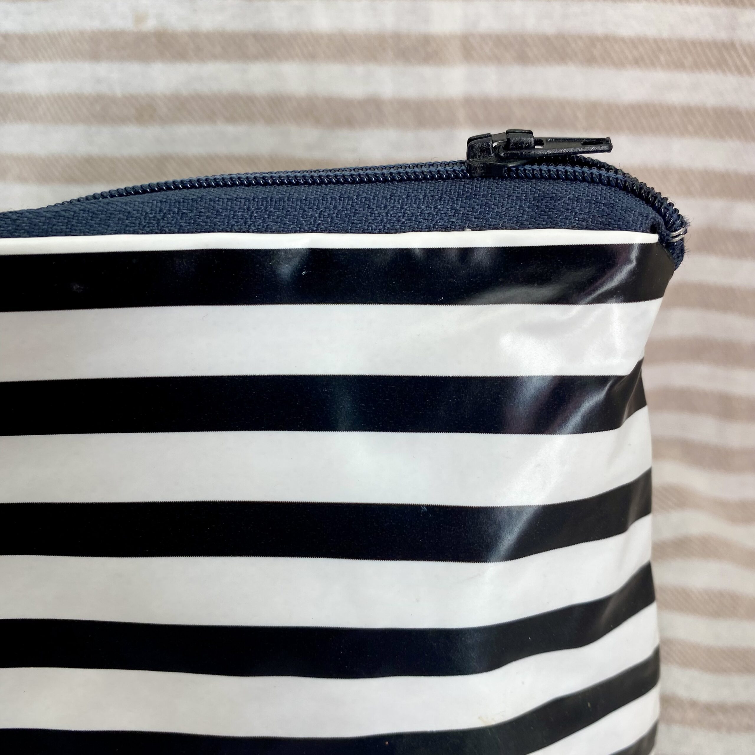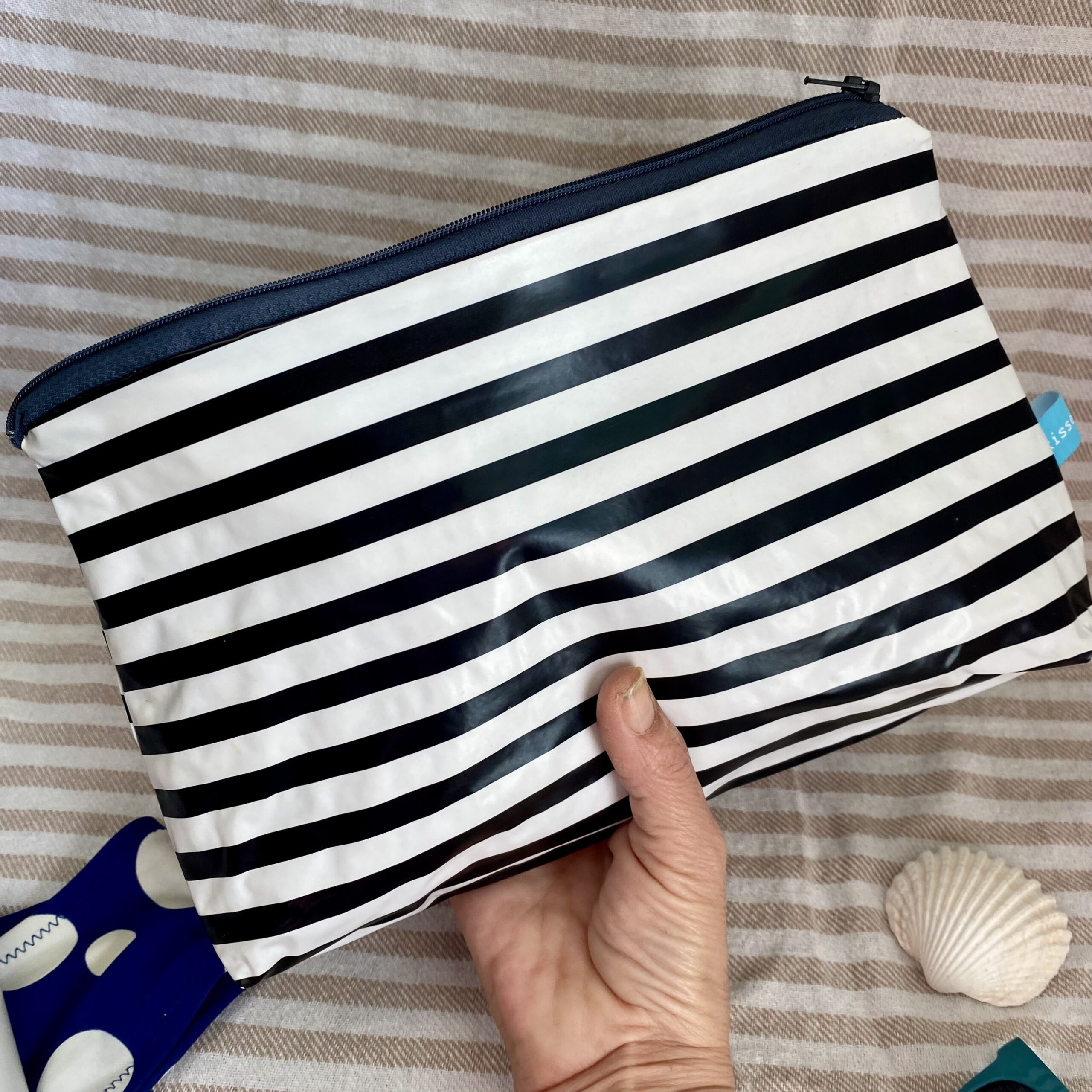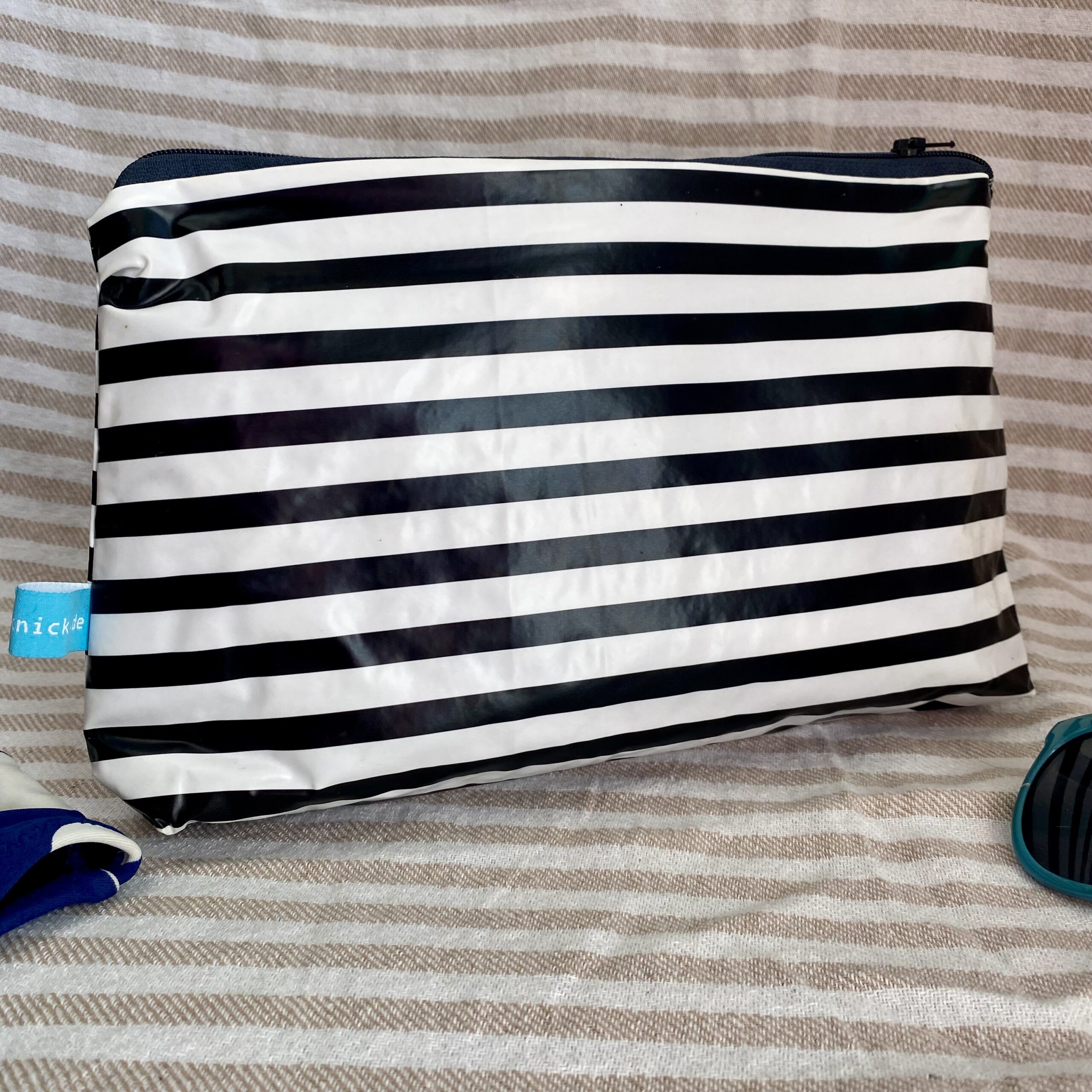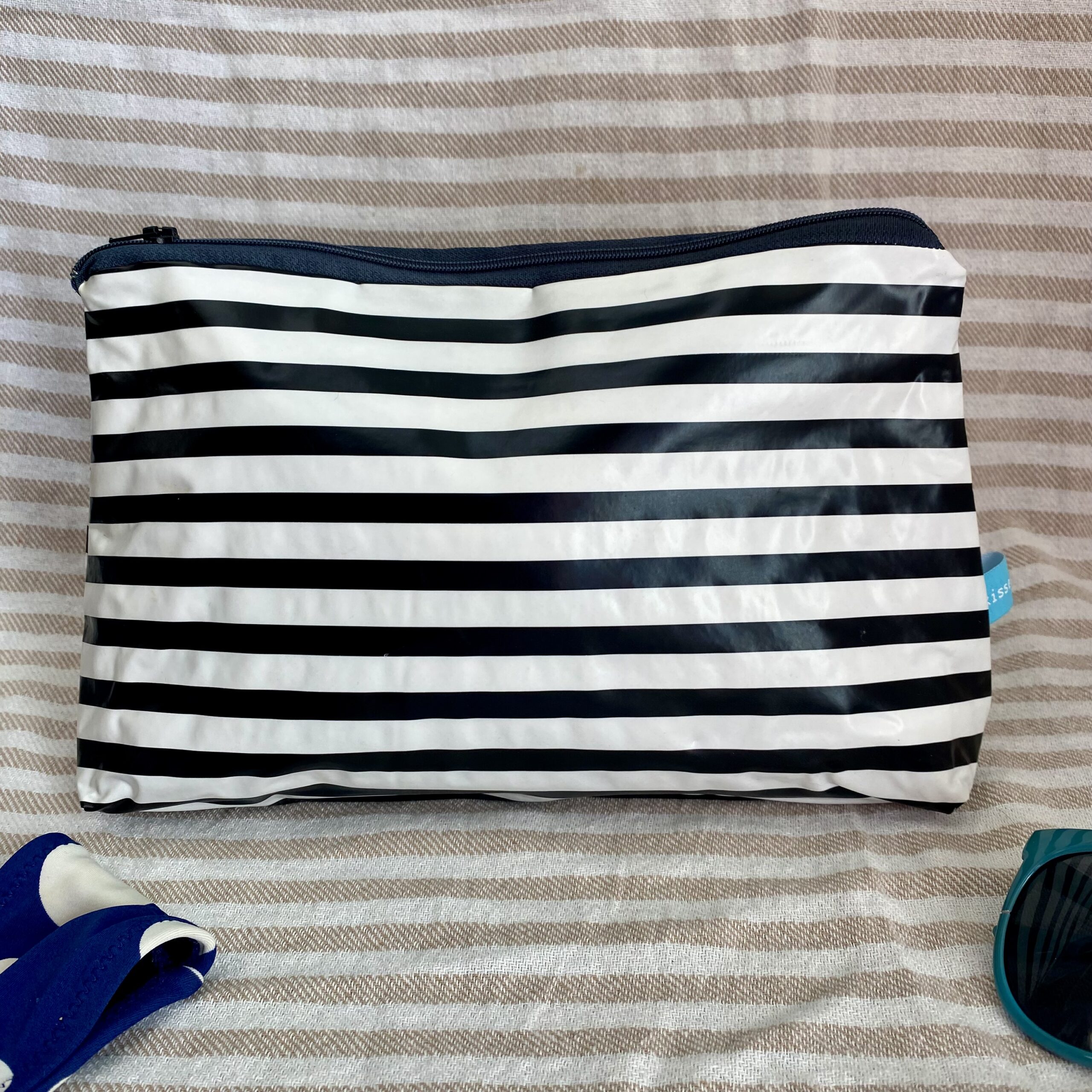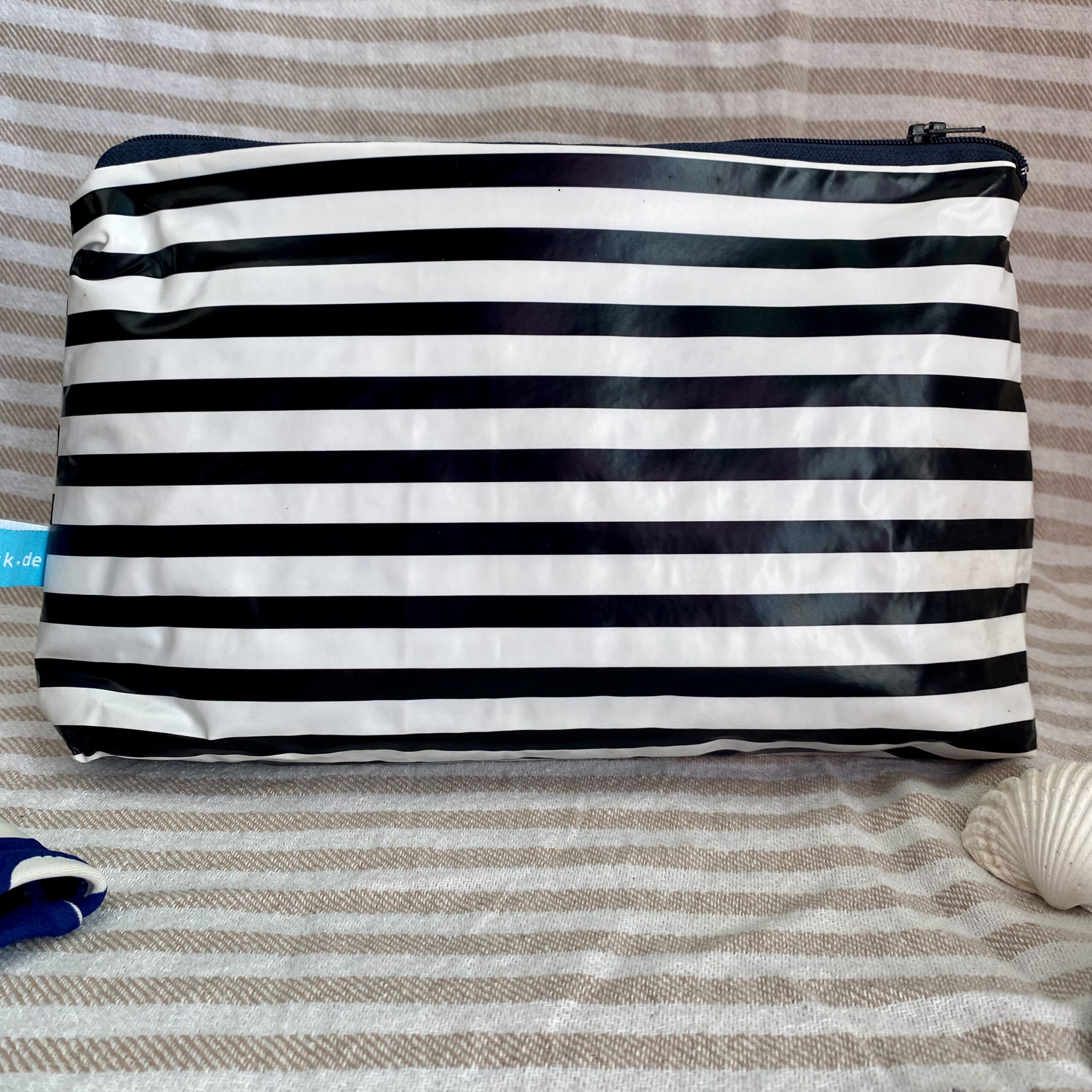 Schwarz-weiß gestreiftes Wetbag aus wasserabweisendem Wachstuch. Perfekt für nasse Badekleidung, Dinge, die auslaufen und alles was vor Wasser, Sand oder Schmutz geschützt werden soll.