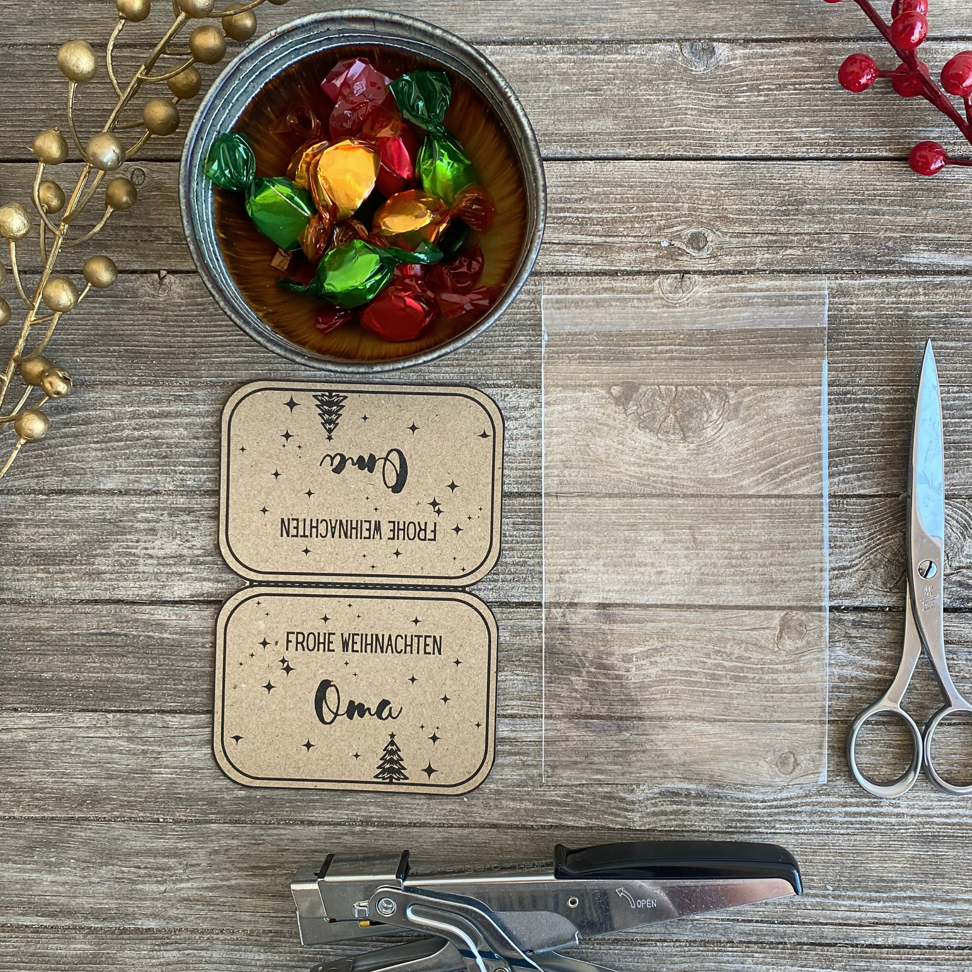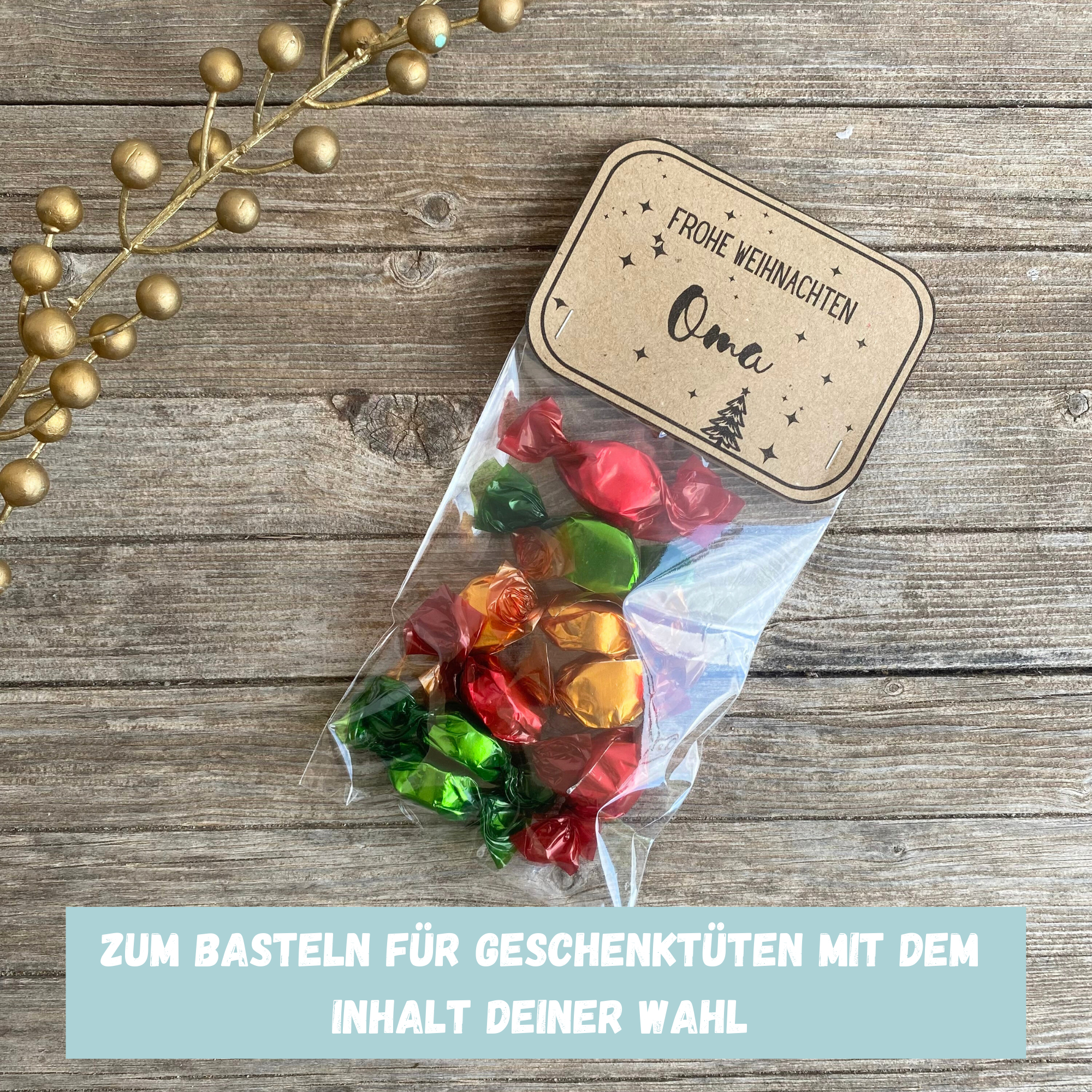 Du kannst mit handelsüblichen Tüten aus Zellophanpapier oder selbst gebastelten Tüten somit schöne weihnachtliche Geschenktüten basteln. Befüllt mit Süssigkeiten oder kleinen Geschenken ist die Geschenktüte in schönes, persönliches Geschenk nur für Deine Oma.