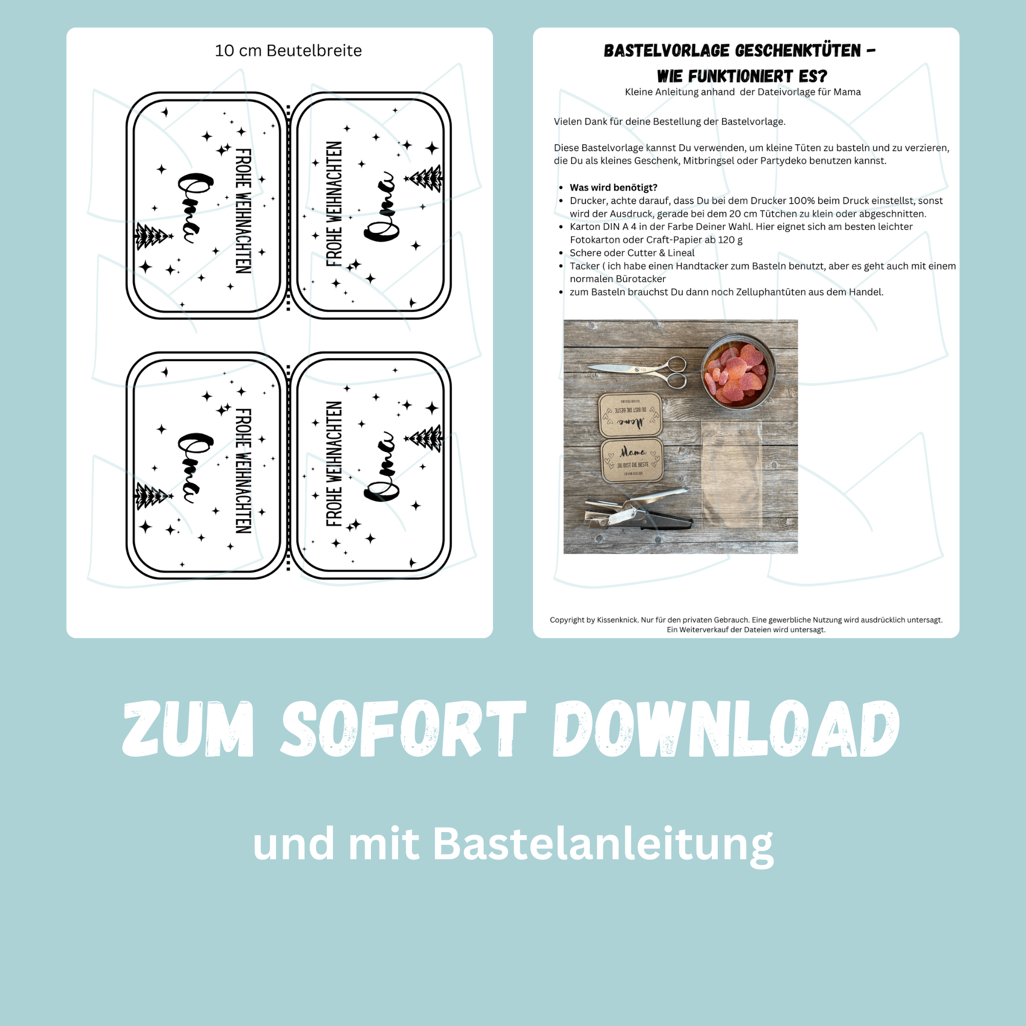 Ein gewerblicher Verkauf, Weitergabe oder Verfielfältigung wird untersagt. Solltest Du Geschenktüten gewerblich verkaufen oder verteilen wollen, findest Du dazu die passende Lizenz in unserem Shop.
