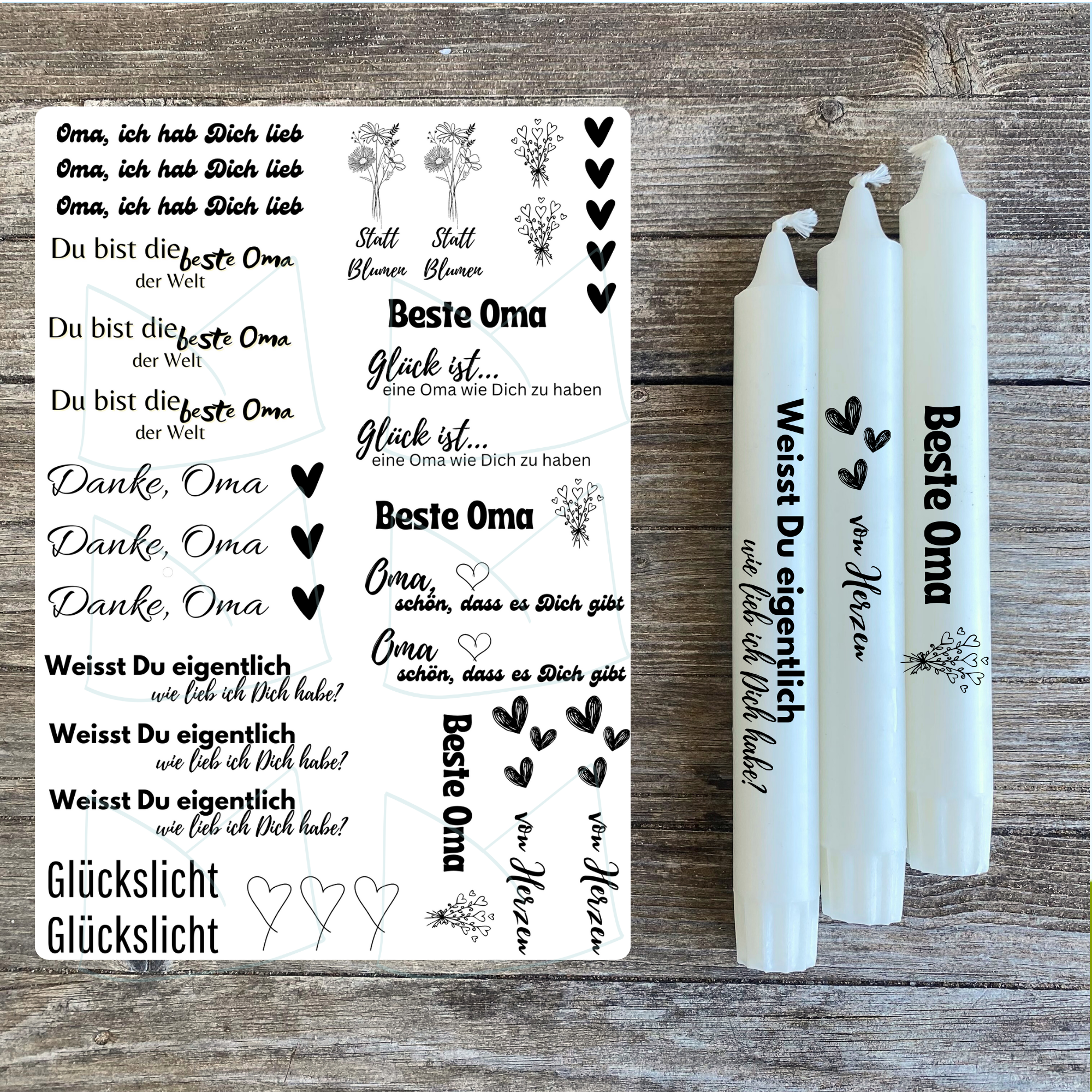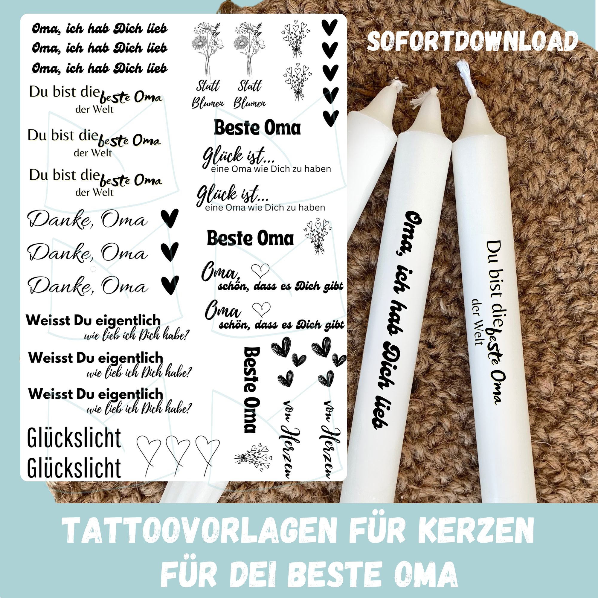 Sag Deiner Oma Danke, sag ihr wie lieb Du sie hast, dass sie immer für Dich da ist. Mit unseren tollen Kerzentattoo – Vorlagen kannst Du liebevolle Kerzen für Deine Oma zum Geburtstag oder einfach mal zwischendurch selber machen.