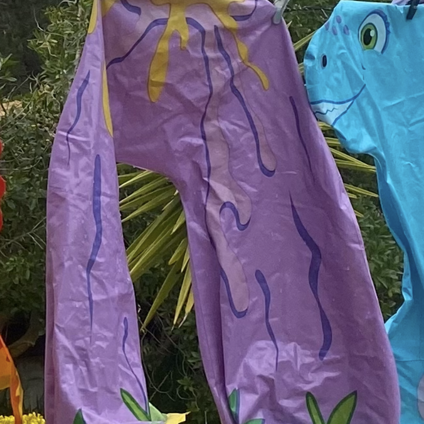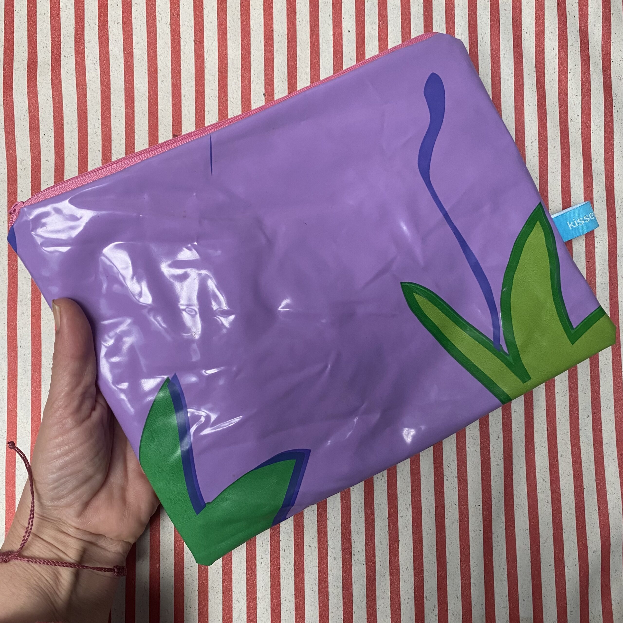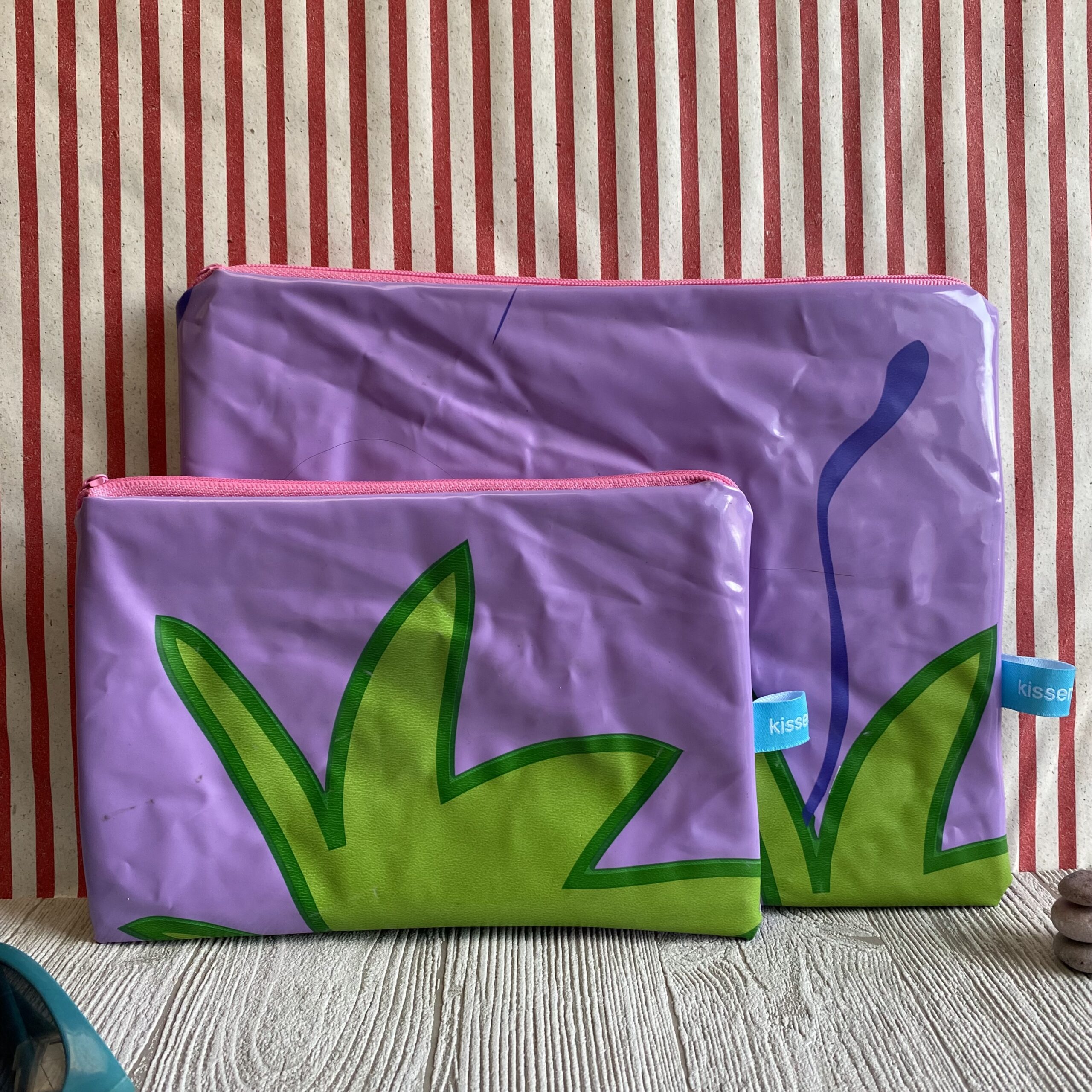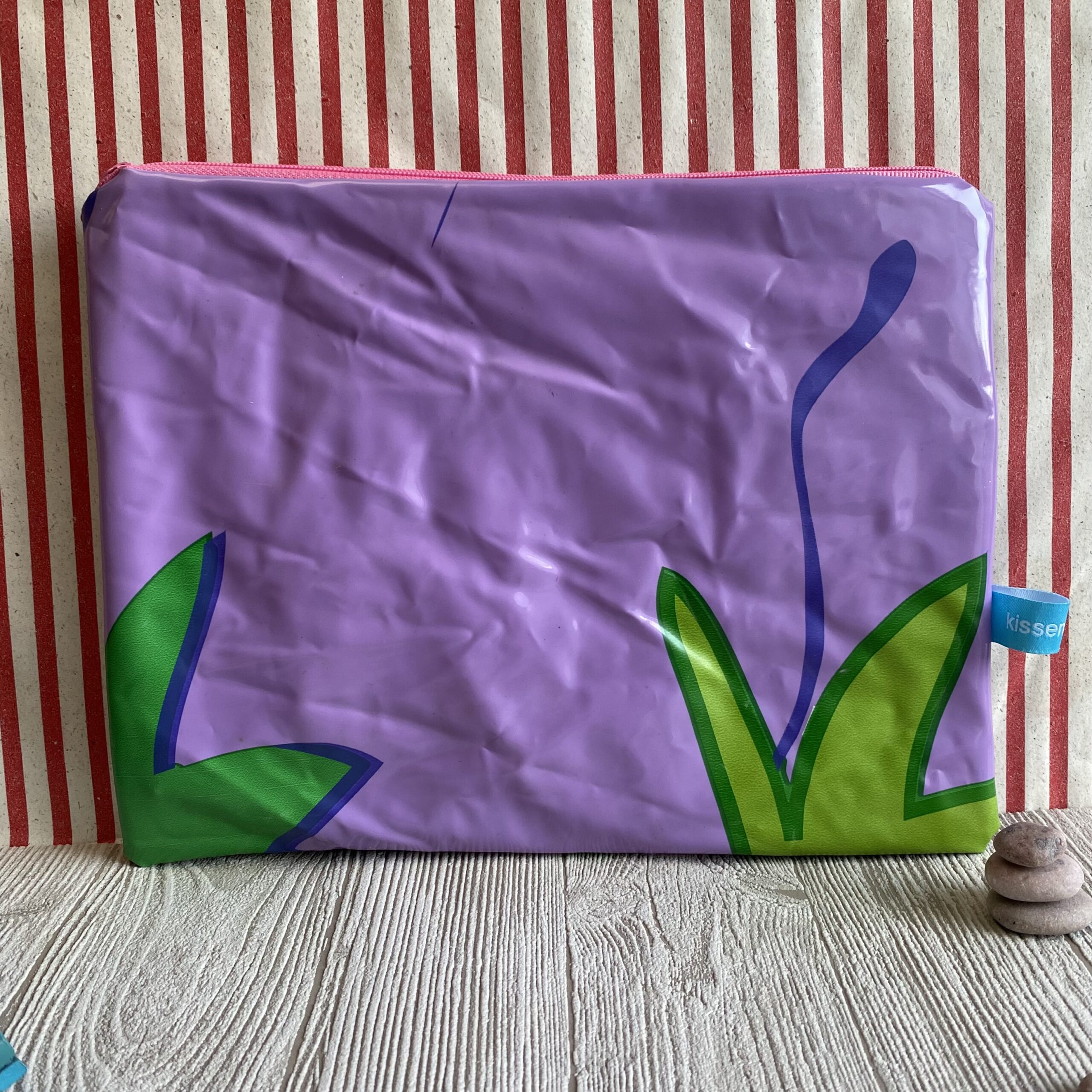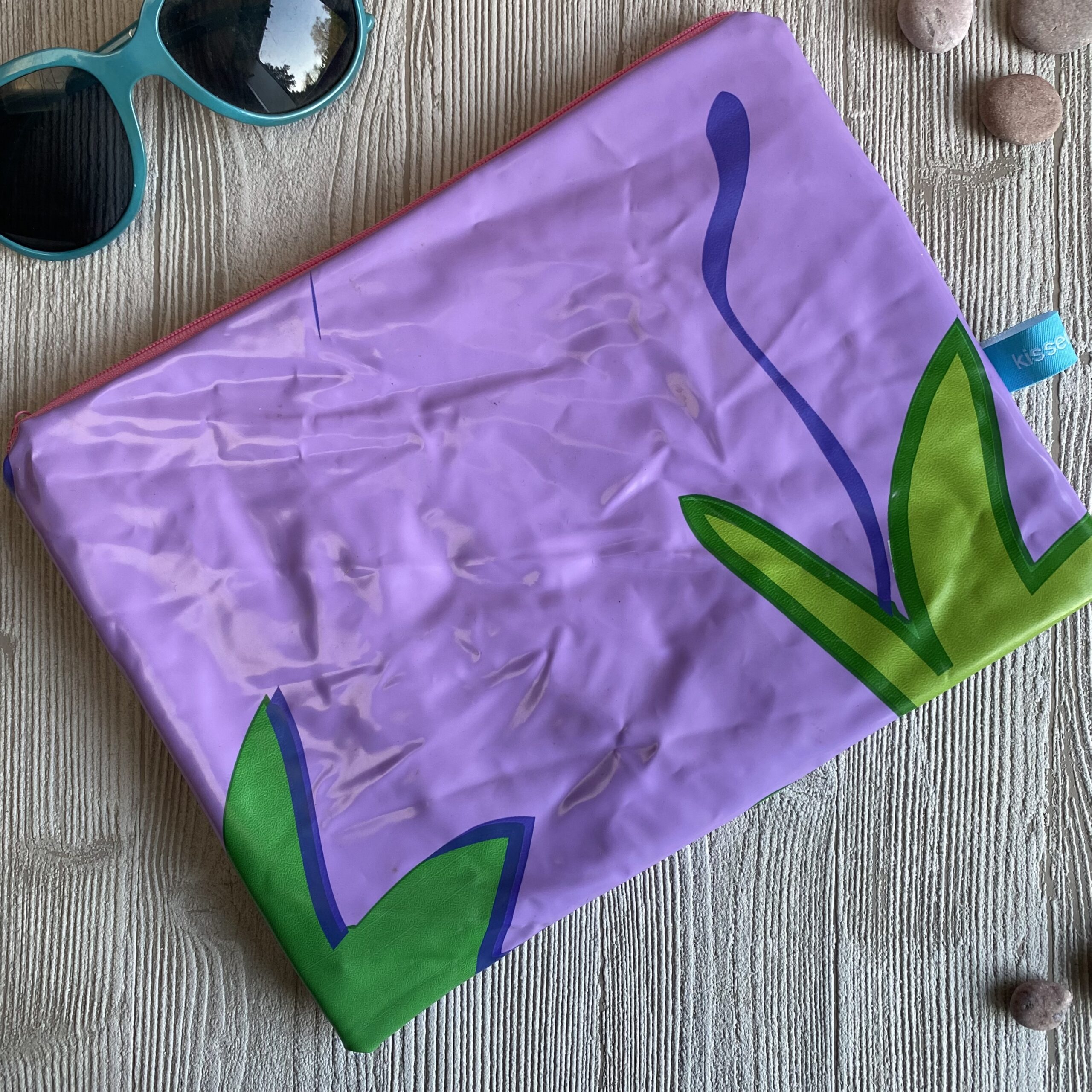Die aufblasbare Schwimmboje für den Pool – ein lila mit Pflanzen – hat von uns ein zweites Leben als Mäppchen bekommen.