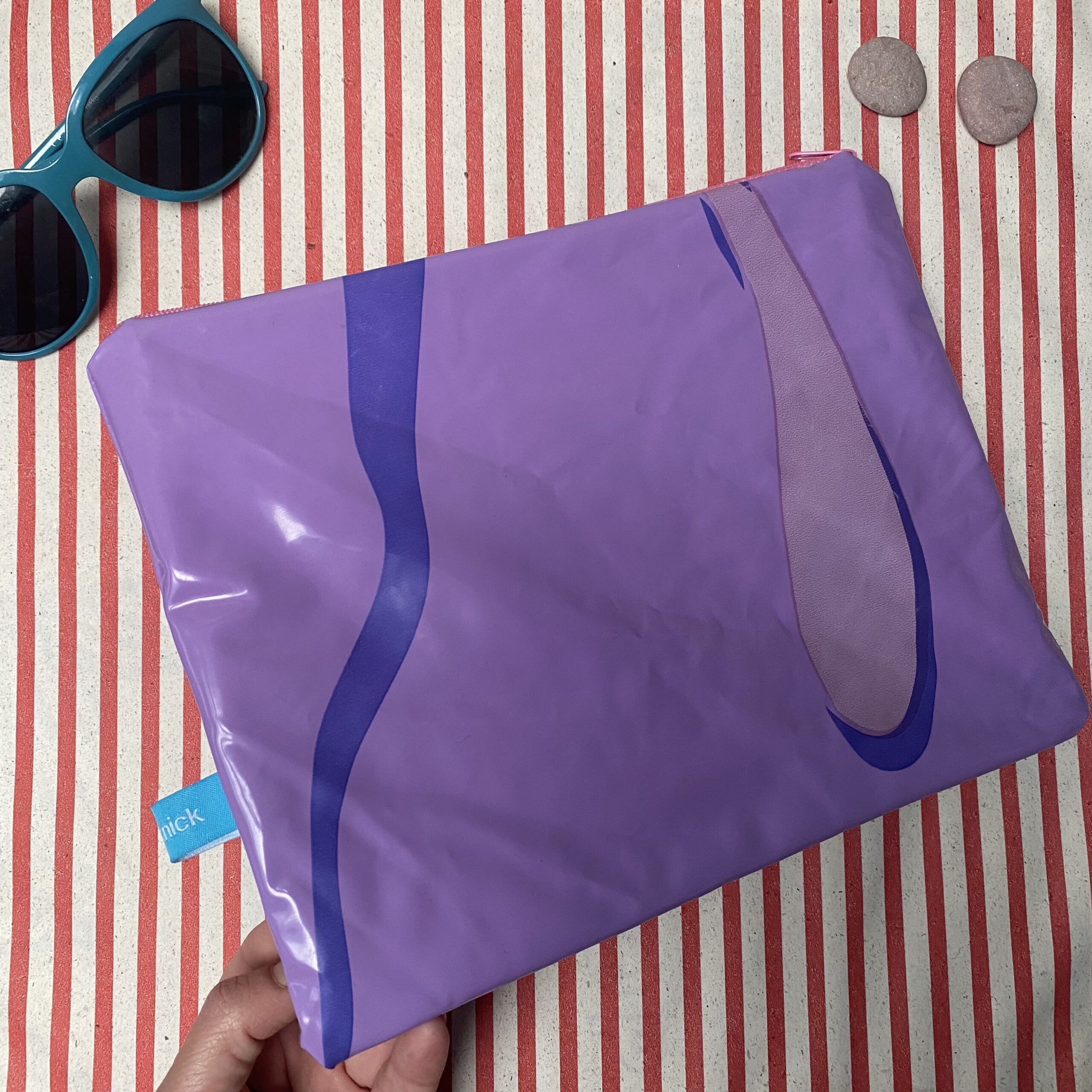 Das recycelte Aussenmaterial PVC ist von Natur aus wasserabweisend, somit ist es perfekt für Dein Tablet oder andere Dinge, die Du sauber und trocken aufbewahren möchtest – Kosmetik, die ausläuft, nasse Badekleidung, um den Rest Deine Tasche zu schützen oder auch Kabel, Handy etc – all das was vor Schmutz oder Nässe geschützt werden möchte.